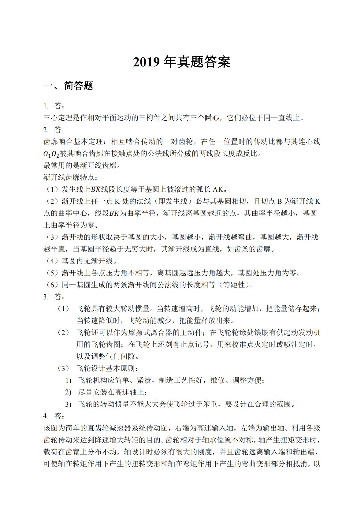 2019年真题答案一、简答题1.答:三心定理是作相对平面运动的三构件之间共有三个瞬心,它们必位于同一直线上。2.答:齿廓啮合基本定理:相互啮合传动的一对齿轮,在任一位置时的传动比都与其连心线12被其啮合齿廓在接触点处的公法线所分成的两线段长度成反比。最常用的是渐开线齿廓。渐开线齿廓特点:(1)发生线上线段长度等于基圆上被滚过的弧长AK。(2)渐开线上任一点K处的法线(即发生线)必与其基圆相切,且切点B为渐开线K点的曲率中心,线段为曲率半径,渐开线离基圆越近的点,其曲率半径越小,基圆上曲率半径为零。(3)渐开线的形状取决于基圆的大小,基圆越小,渐开线越弯曲,基圆越大,渐开线越平直,当...
