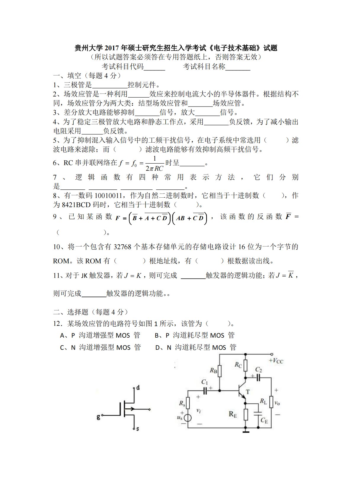 贵州大学834电子技术2017年真题
