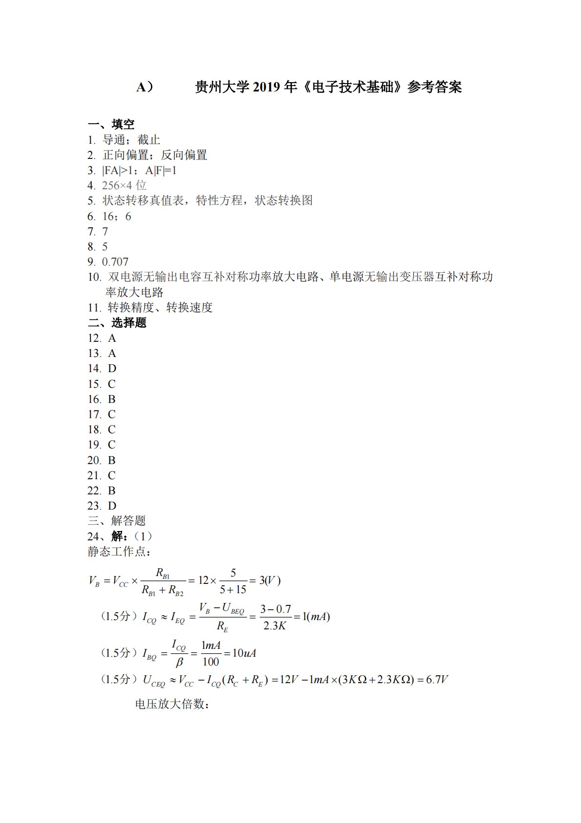 A)贵州大学2019年《电子技术基础》参考答案一、填空1.导通;截止2.正向偏置;反向偏置3.|FA|>1;A|F|=14.256×4位5.状态转移真值表,特性方程,状态转换图6.16;67.78.59.0.70710.双电源无输出电容互补对称功率放大电路、单电源无输出变压器互补对称功率放大电路11.转换精度、转换速度二、选择题12.A13.A14.D15.C16.B17.C18.C19.C20.B21.C22.B23.D三、解答题24、解:(1)静态工作点:1125123()51530.71.51()2.311.5101001.5()121(32.3)6.7BBCCBBBBEQCQEQECQ...