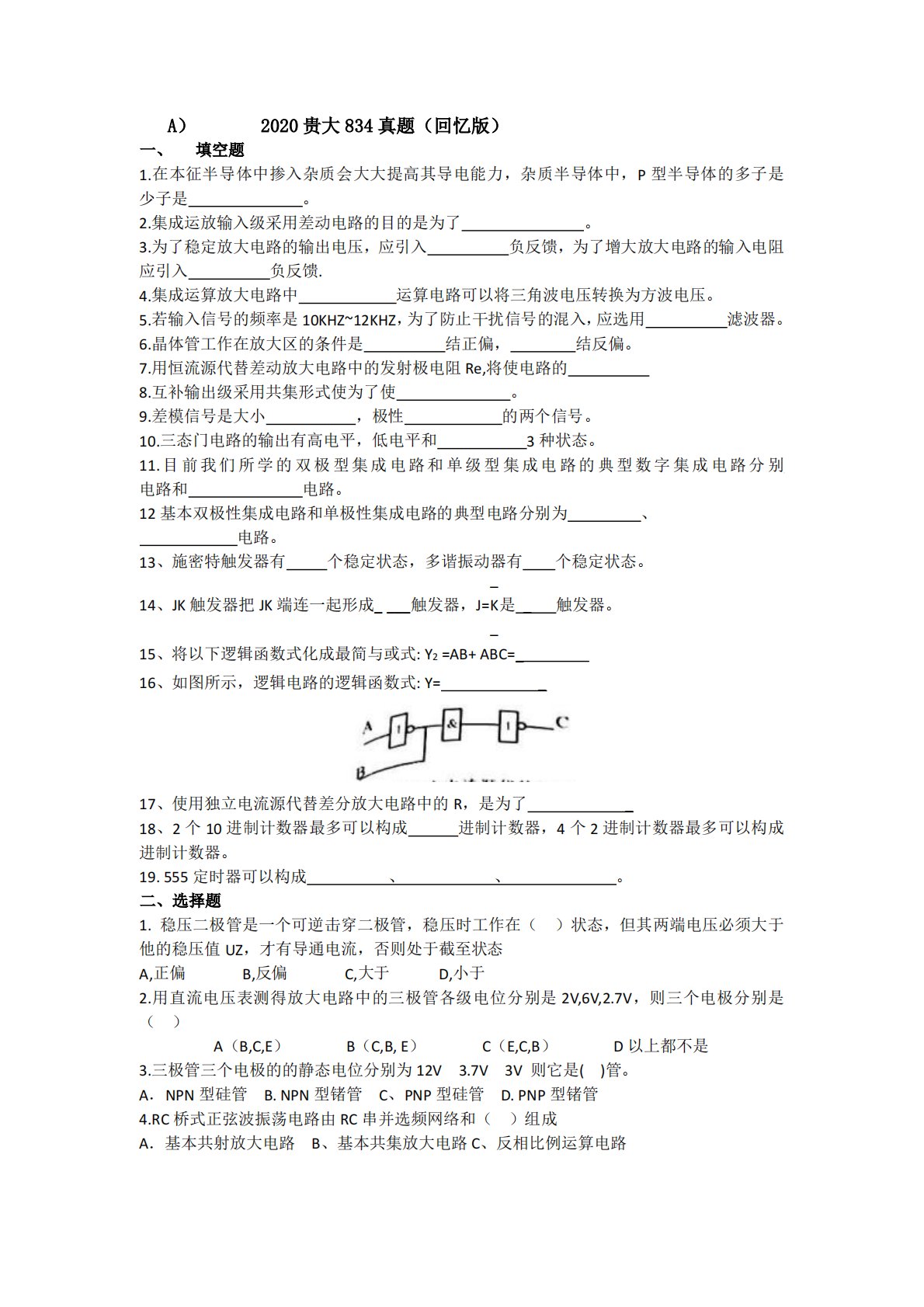 A)2020贵大834真题(回忆版)一、填空题1.在本征半导体中掺入杂质会大大提高其导电能力,杂质半导体中,P型半导体的多子是少子是。2.集成运放输入级采用差动电路的目的是为了。3.为了稳定放大电路的输出电压,应引入负反馈,为了增大放大电路的输入电阻应引入负反馈.4.集成运算放大电路中运算电路可以将三角波电压转换为方波电压。5.若输入信号的频率是10KHZ~12KHZ,为了防止干扰信号的混入,应选用滤波器。6.晶体管工作在放大区的条件是结正偏,结反偏。7.用恒流源代替差动放大电路中的发射极电阻Re,将使电路的8.互补输出级采用共集形式使为了使。9.差模信号是大小,极性的两个信号。10.三态门电...