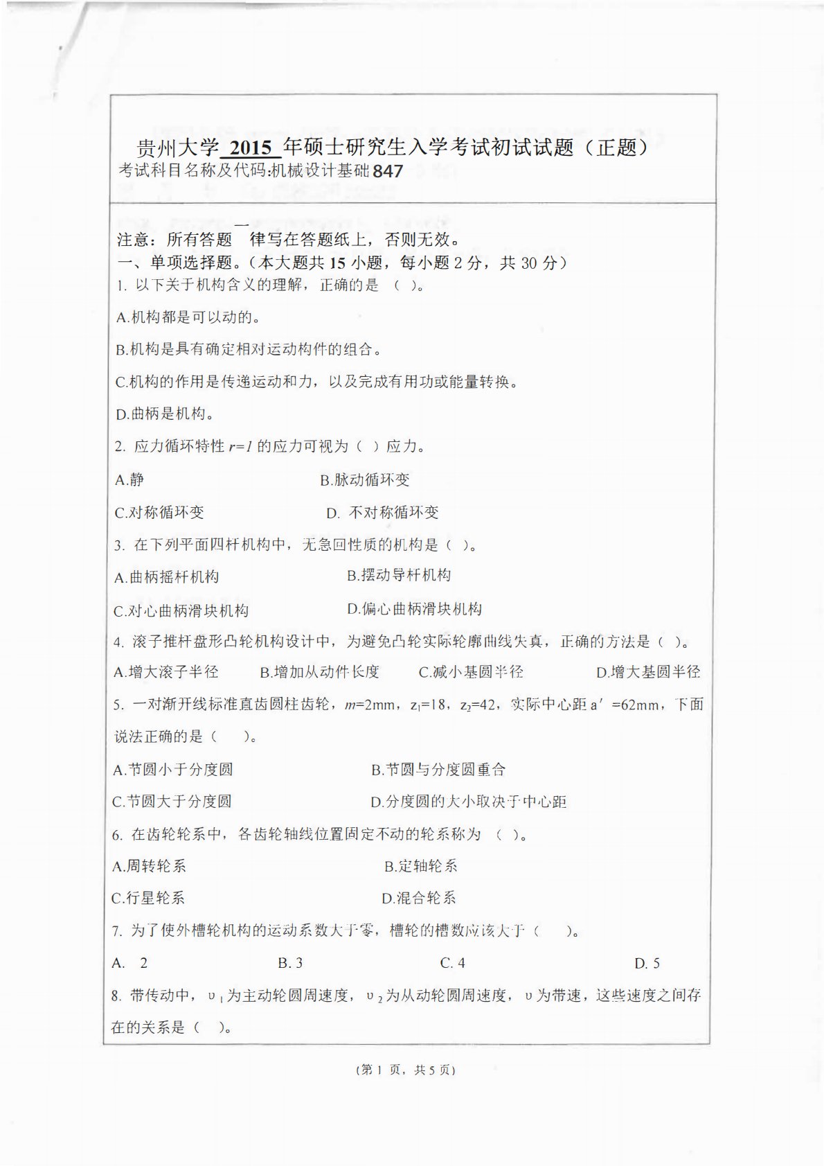贵州大学呈但立年硕士研究生入学考试初试试题(正题)考试科目名称及代码:机械设计基础847一注意:所有答题律写在答题纸上,否则无效。一、单项选择题。(本大题共15小题,每小题2分,共30分)I以下关于机构含义的理解,正确的是()。A机构都是可以动的。B机构是具有确定相对运动构件的组合。C机构的作用是传递运动和力,以及完成有用功或能罹转换。D曲柄是机构。2.应力循环特性r=I的应力可视为()应力。A静B脉动循环变C对称循环变D不对称循环变3在下列平面匹杆机构中,无急回性质的机构是()。A曲柄摇杆机构B摆动导杆机构C对心曲柄滑块机构D偏心曲柄滑块机构4滚子推杆盘形凸轮机构设计中,为避免凸轮实际轮廓怕...