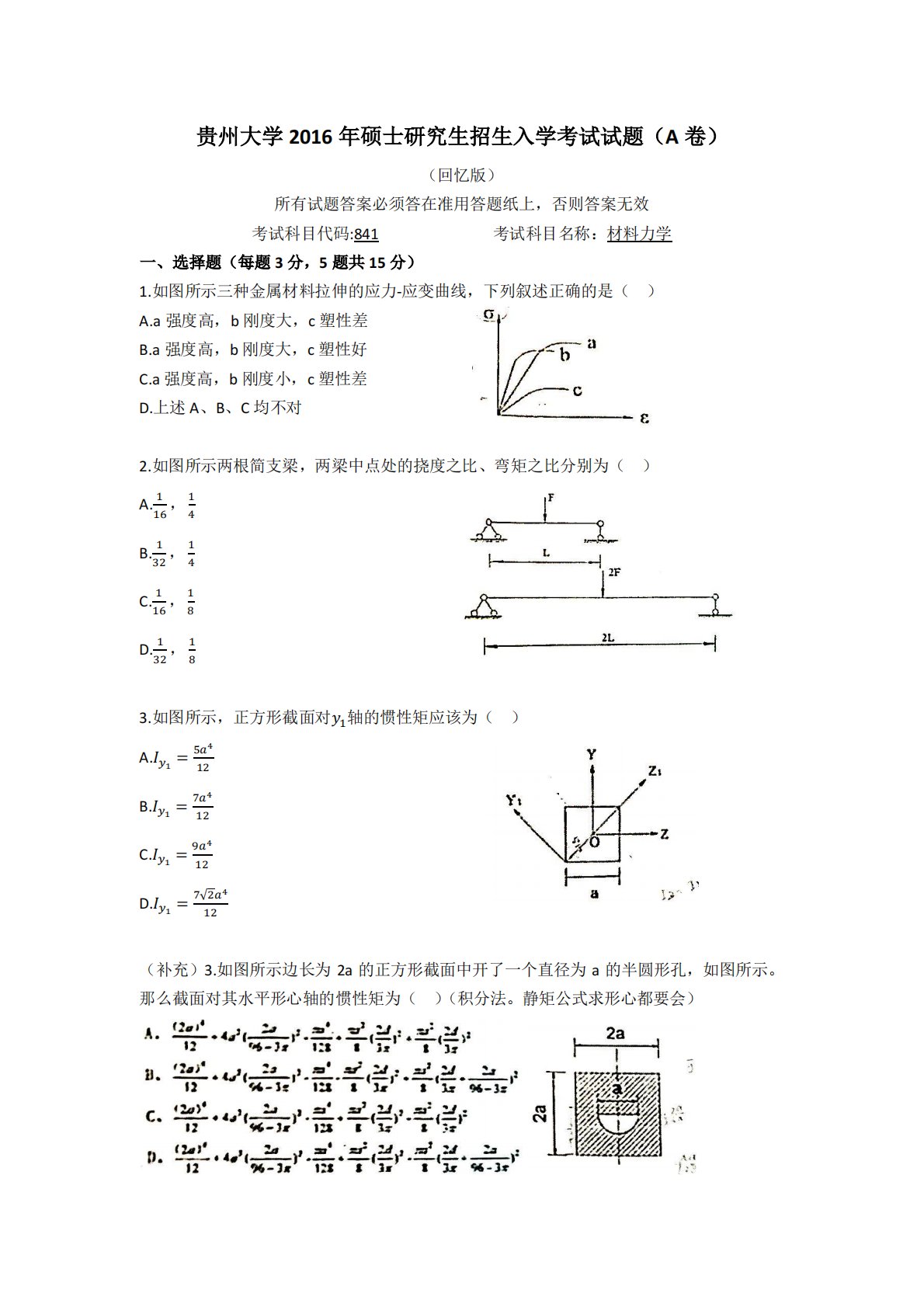 贵州大学2016年硕士研究生招生入学考试试题(A卷)(回忆版)所有试题答案必须答在准用答题纸上,否则答案无效考试科目代码:841考试科目名称:材料力学一、选择题(每题3分,5题共15分)1.如图所示三种金属材料拉伸的应力-应变曲线,下列叙述正确的是()A.a强度高,b刚度大,c塑性差B.a强度高,b刚度大,c塑性好C.a强度高,b刚度小,c塑性差D.上述A、B、C均不对2.如图所示两根简支梁,两梁中点处的挠度之比、弯矩之比分别为()A.116,14B.132,14C.116,18D.132,183.如图所示,正方形截面对1轴的惯性矩应该为()A.1=5412B.1=7...