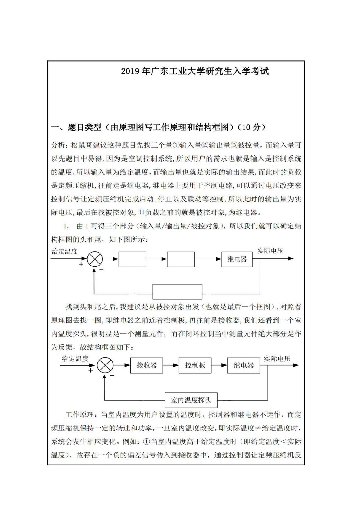 转,从而使实际温度(室内温度)下降,直至(实际温度=给定温度)时,即偏差信号为0,控制器和继电器停止工作,定频压缩机保持此时的转速,系统稳定。②反之,当室内温度低于给定温度时(即给定温度>实际温度),故存在一个正的偏差信号传入到接收器中,通过控制器让定频压缩机正转,从而使实际温度(室内温度)上升,直至(实际温度=给定温度)时,即偏差信号为0,控制器和继电器停止工作,定频压缩机保持此时的转速,系统稳定。★★松鼠哥(QQ474477492)提示:此类题目属于第一章内容并且系统是标准的闭环控制系统,题目问法固定为①结构框图②工作原理,答题套路也很固定。如下:结构框图:先找输入/输出/被控对象,画一个...