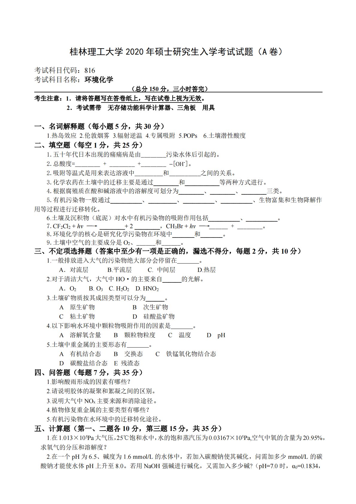 桂林理工大学2020年硕士研究生入学考试试题(A卷)考试科目代码:816考试科目名称:环境化学(总分150分,三小时答完)考生注意:1.请将答题写在答卷纸上,写在试卷上视为无效。2.考试需带无存储功能科学计算器、三角板用具一、名词解释题(每小题5分,共30分)1.热岛效应2.伦敦烟雾3.辐射逆温4.专属吸附5.POPs6.土壤潜性酸度二、填空题(每空1分,共25分)1.五十年代日本出现的痛痛病是由________污染水体后引起的。2.总酸度=________+________+________[OH-]。2.吸附等温式是用来表达溶液中_________和__________之间的关系。3.化...
