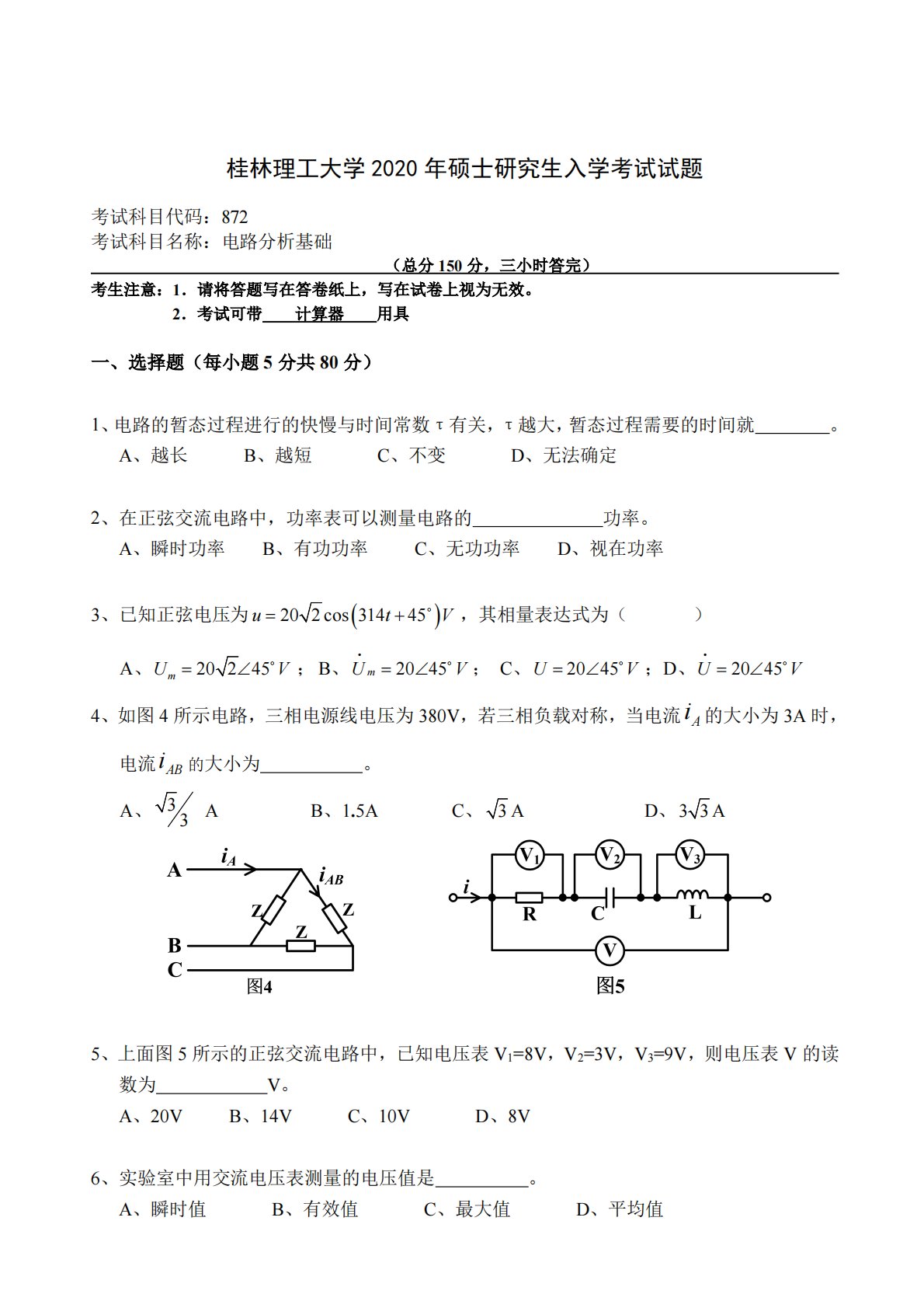 桂林理工大学2020年硕士研究生入学考试试题考试科目代码:872考试科目名称:电路分析基础(总分150分,三小时答完)考生注意:1.请将答题写在答卷纸上,写在试卷上视为无效。2.考试可带计算器用具一、选择题(每小题5分共80分)1、电路的暂态过程进行的快慢与时间常数τ有关,τ越大,暂态过程需要的时间就。A、越长B、越短C、不变D、无法确定2、在正弦交流电路中,功率表可以测量电路的功率。A、瞬时功率B、有功功率C、无功功率D、视在功率3、已知正弦电压为u202cos314t45V,其相量表达式为()A、Um20245V;B、Um2045V;C、U2045V;...