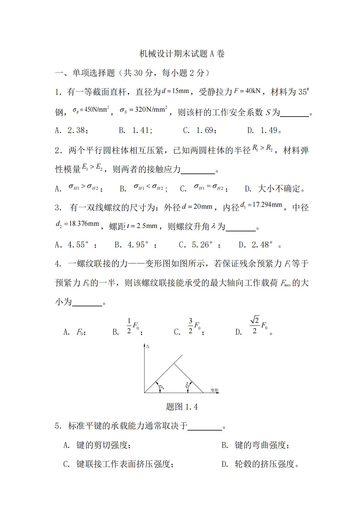 机械设计期末试题A卷一、单项选择题(共30分,每小题2分)1.有一等截面直杆,直径为15mmd=,受静拉力40kNF=,材料为35#钢,2450N/mmBσ=,2320N/mmSσ=,则该杆的工作安全系数S为。A.2.38;B.1.41;C.1.69;D.1.49。2.两个平行圆柱体相互压紧,已知两圆柱体的半径12RR>,材料弹性模量12EE>,则两者的接触应力。A.12HHσσ>;B.12HHσσ<;C.12HHσσ=;D.大小不确定。3.有一双线螺纹的尺寸为:外径20mmd=,内径117.294mmd=,中径218.376mmd=,螺距2.5mmt=,则螺纹升角λ为。A.4.55°;B.4...