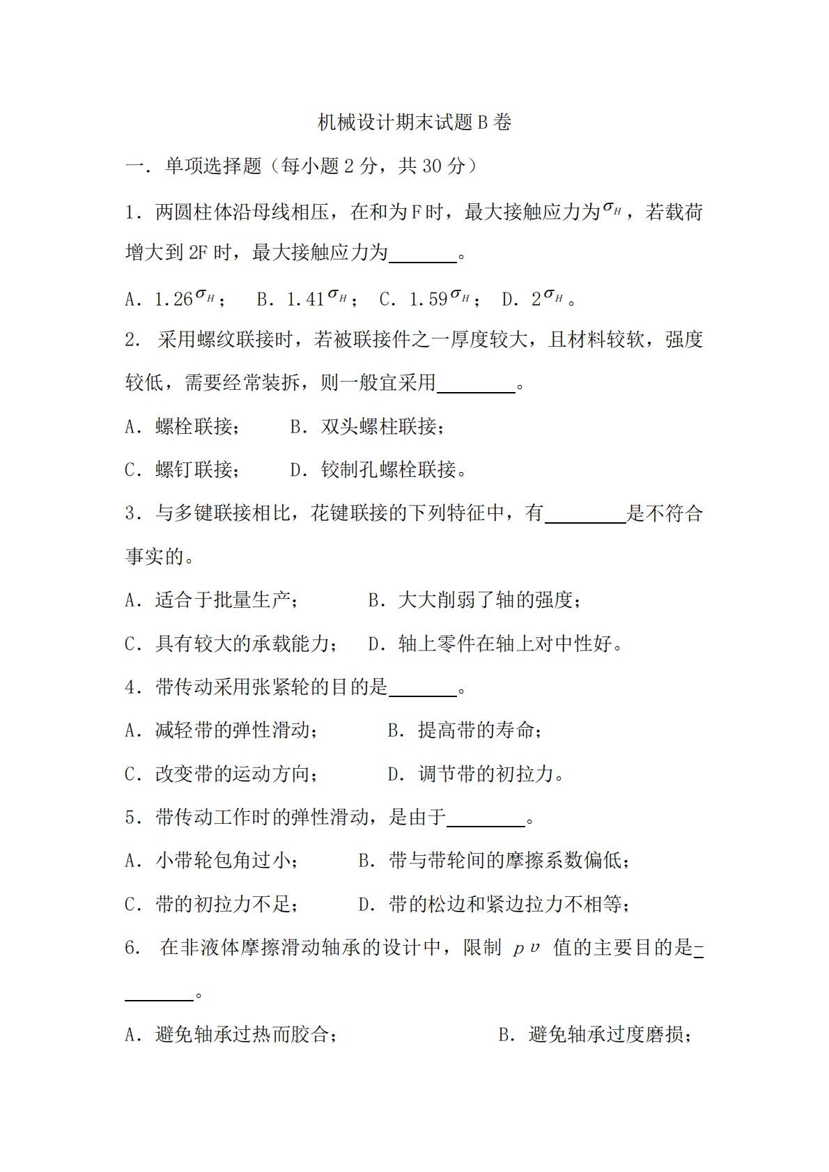 机械设计期末试题B卷一.单项选择题(每小题2分,共30分)1.两圆柱体沿母线相压,在和为F时,最大接触应力为Hσ,若载荷增大到2F时,最大接触应力为。A.1.26Hσ;B.1.41Hσ;C.1.59Hσ;D.2Hσ。2.采用螺纹联接时,若被联接件之一厚度较大,且材料较软,强度较低,需要经常装拆,则一般宜采用。A.螺栓联接;B.双头螺柱联接;C.螺钉联接;D.铰制孔螺栓联接。3.与多键联接相比,花键联接的下列特征中,有是不符合事实的。A.适合于批量生产;B.大大削弱了轴的强度;C.具有较大的承载能力;D.轴上零件在轴上对中性好。4.带传动采用张紧轮的目的是。A.减轻带的弹性滑动;B.提高带的寿命...