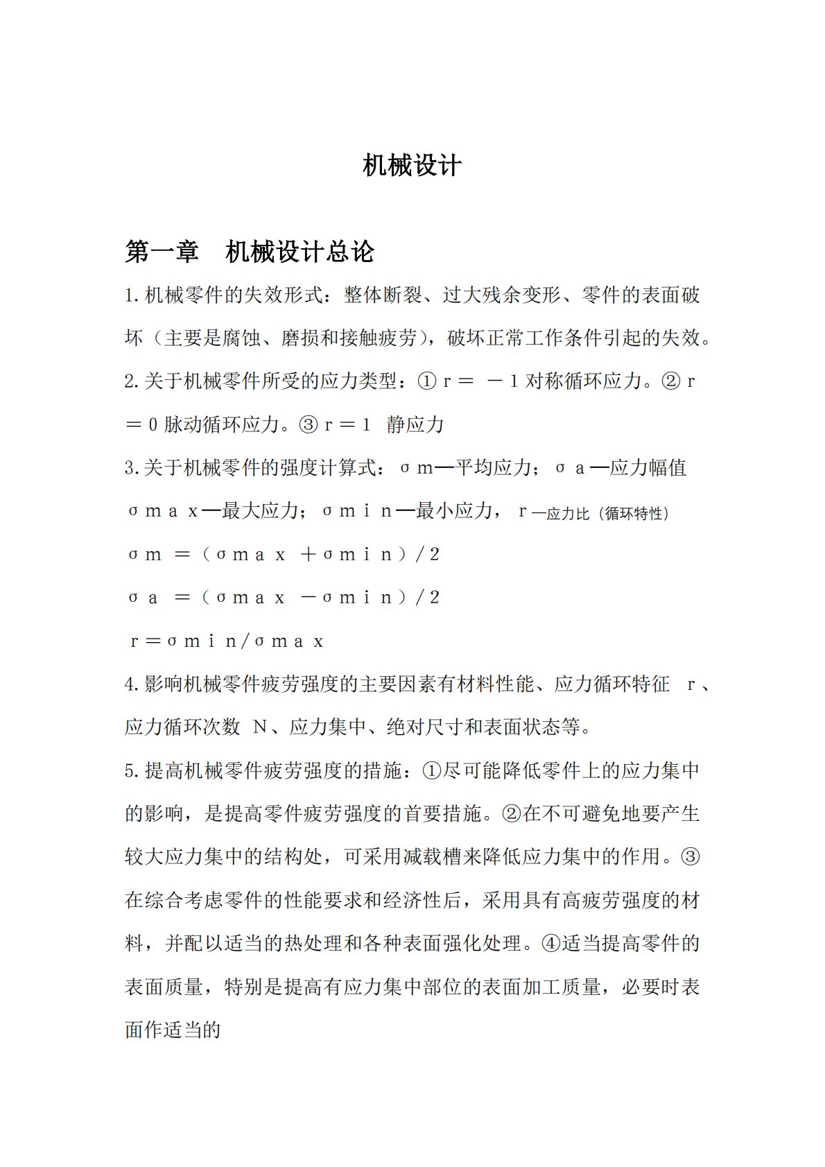 机械设计第一章机械设计总论1.机械零件的失效形式:整体断裂、过大残余变形、零件的表面破坏(主要是腐蚀、磨损和接触疲劳),破坏正常工作条件引起的失效。2.关于机械零件所受的应力类型:①r=-1对称循环应力。②r=0脉动循环应力。③r=1静应力3.关于机械零件的强度计算式:σm─平均应力;σa─应力幅值σmax─最大应力;σmin─最小应力,r─应力比(循环特性)σm=(σmax+σmin)/2σa=(σmax-σmin)/2r=σmin/σmax4.影响机械零件疲劳强度的主要因素有材料性能、应力循环特征r、应力循环次数N、应力集中、绝对尺寸和表面状态等。5.提高机械零件疲劳强度的措施:①尽可能降...