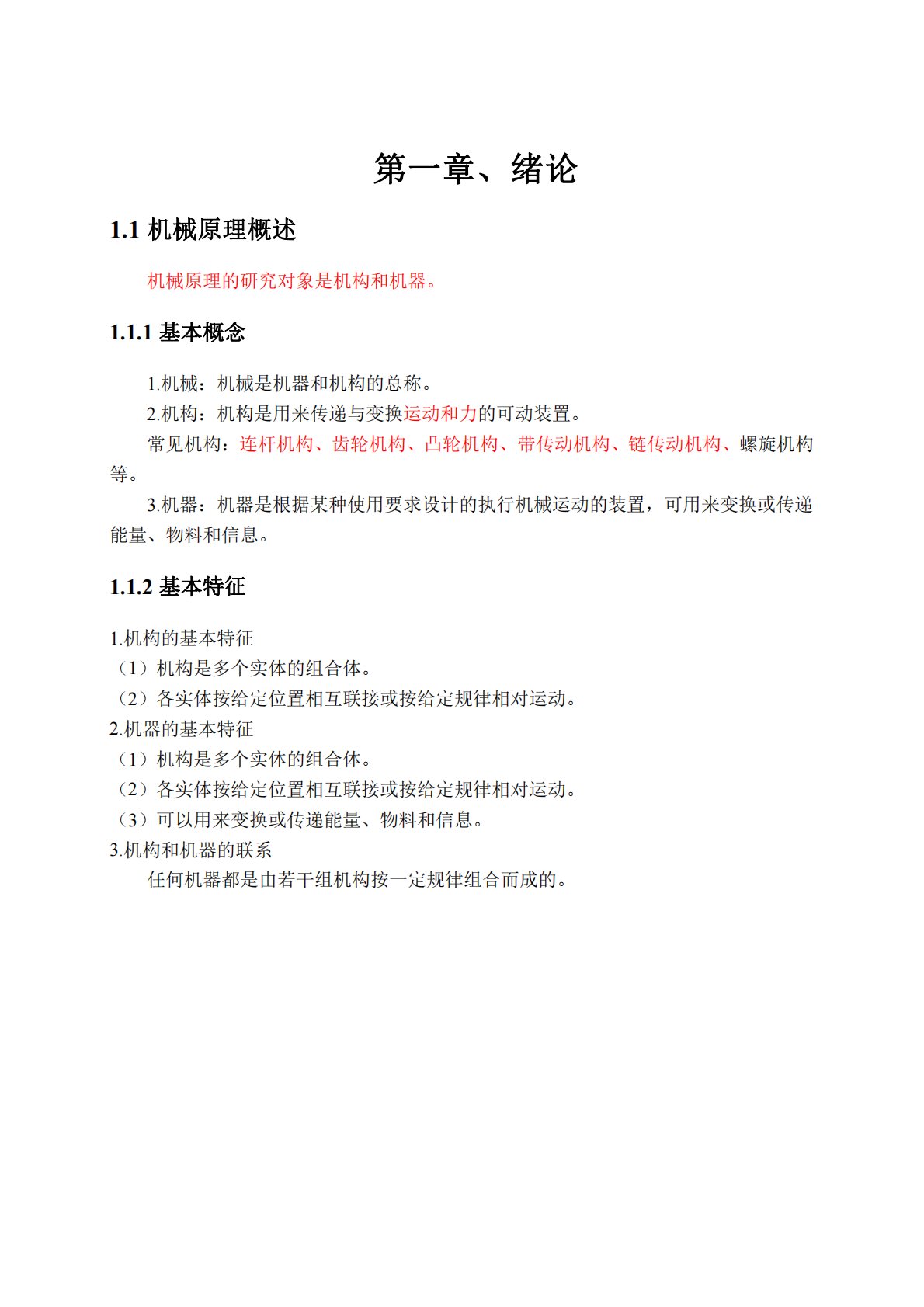 第一章、绪论1.1机械原理概述机械原理的研究对象是机构和机器。1.1.1基本概念1.机械:机械是机器和机构的总称。2.机构:机构是用来传递与变换运动和力的可动装置。常见机构:连杆机构、齿轮机构、凸轮机构、带传动机构、链传动机构、螺旋机构等。3.机器:机器是根据某种使用要求设计的执行机械运动的装置,可用来变换或传递能量、物料和信息。1.1.2基本特征1.机构的基本特征(1)机构是多个实体的组合体。(2)各实体按给定位置相互联接或按给定规律相对运动。2.机器的基本特征(1)机构是多个实体的组合体。(2)各实体按给定位置相互联接或按给定规律相对运动。(3)可以用来变换或传递能量、物料和信息。3.机构...