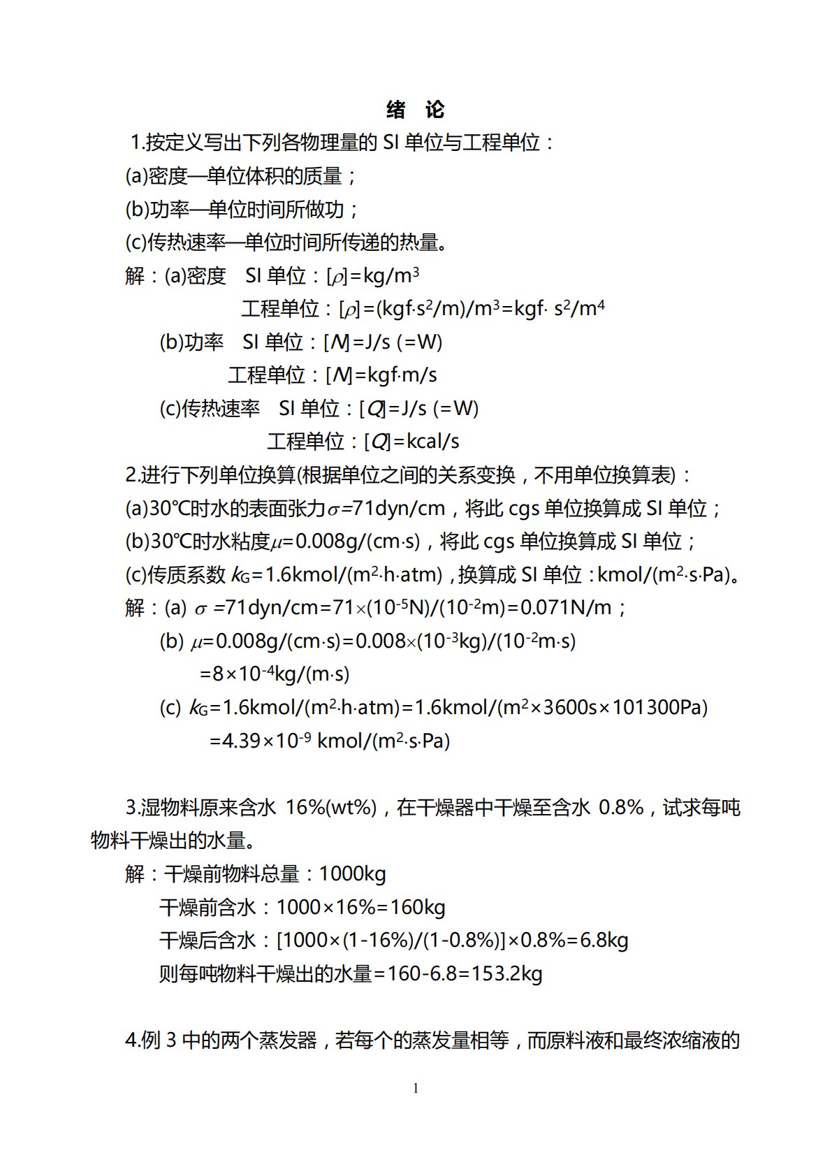 1绪论1.按定义写出下列各物理量的SI单位与工程单位:(a)密度—单位体积的质量;(b)功率—单位时间所做功;(c)传热速率—单位时间所传递的热量。解:(a)密度SI单位:[]=kg/m3工程单位:[]=(kgfs2/m)/m3=kgfs2/m4(b)功率SI单位:[N]=J/s(=W)工程单位:[N]=kgfm/s(c)传热速率SI单位:[Q]=J/s(=W)工程单位:[Q]=kcal/s2.进行下列单位换算(根据单位之间的关系变换,不用单位换算表):(a)30℃时水的表面张力=71dyn/cm,将此cgs单位换算成SI单位;(b)30℃时水粘度=0.008g/(cms),将...