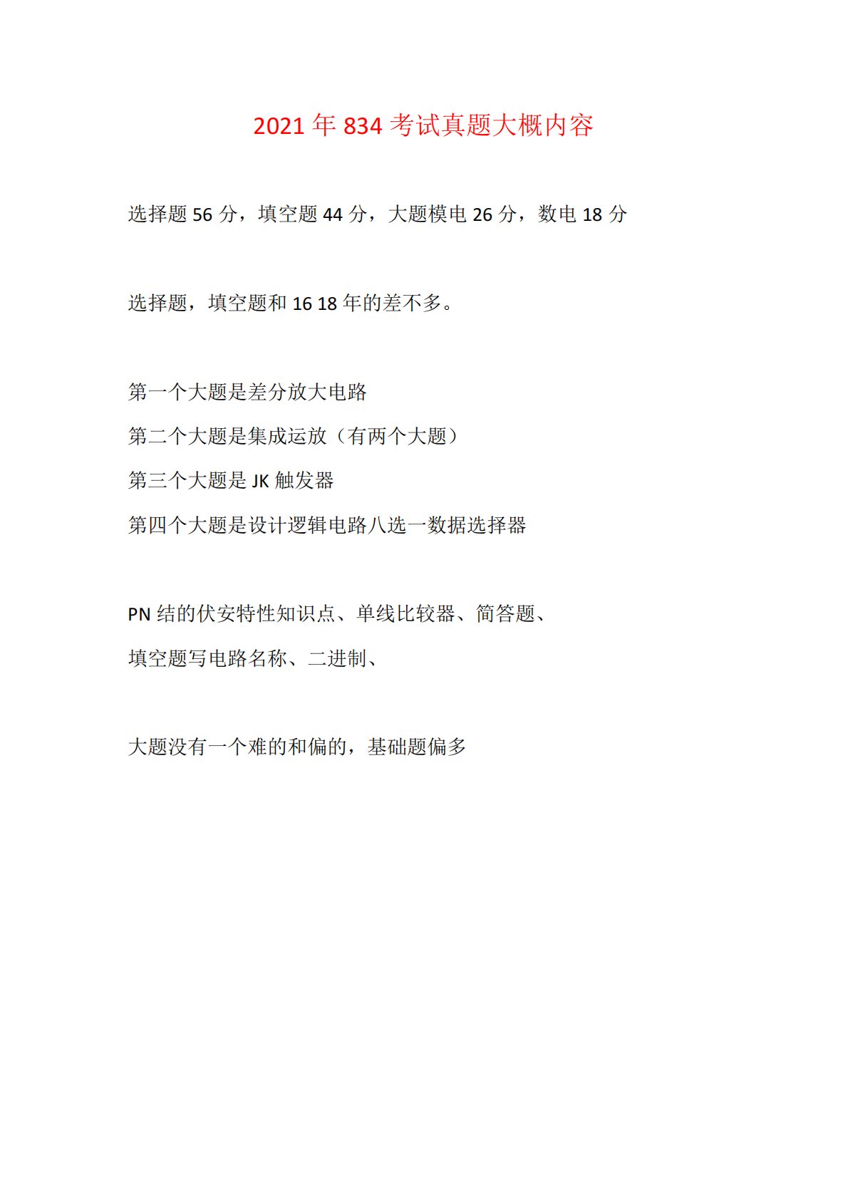 2021年834考试真题大概内容选择题56分,填空题44分,大题模电26分,数电18分选择题,填空题和1618年的差不多。第一个大题是差分放大电路第二个大题是集成运放(有两个大题)第三个大题是JK触发器第四个大题是设计逻辑电路八选一数据选择器PN结的伏安特性知识点、单线比较器、简答题、填空题写电路名称、二进制、大题没有一个难的和偏的,基础题偏多百校文库—海量高校资料共享库百校文库是一个线上大学生专业学习资料共享平台,致力于通过用户自主上传与分享,打造一个涵盖各大高校、各学科门类的免费资源中心。平台已积累50万+套历年真题与100万+条学习文档,覆盖绝大多数高校专业,所有资料均由各大高校学生自主...