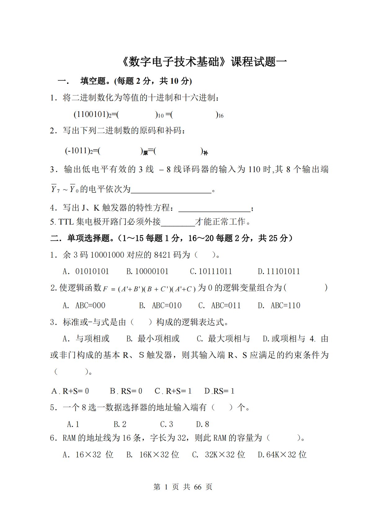 第1页共66页《数字电子技术基础》课程试题一一.填空题。(每题2分,共10分)1.将二进制数化为等值的十进制和十六进制:(1100101)2=()10=()162.写出下列二进制数的原码和补码:(-1011)2=()原=()补3.输出低电平有效的3线–8线译码器的输入为110时,其8个输出端07~YY的电平依次为。4.写出J、K触发器的特性方程:;5.TTL集电极开路门必须外接________才能正常工作。二.单项选择题。(1~15每题1分,16~20每题2分,共25分)1.余3码10001000对应的8421码为()。A.01010101B.10000101C.10111011D.11101...