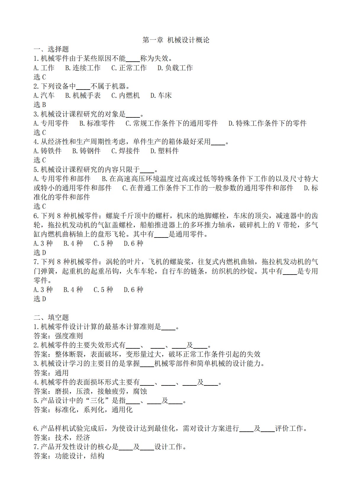 第一章机械设计概论一﹑选择题1.机械零件由于某些原因不能____称为失效。A.工作B.连续工作C.正常工作D.负载工作选C2.下列设备中____不属于机器。A.汽车B.机械手表C.内燃机D.车床选B3.机械设计课程研究的对象是____。A.专用零件B.标准零件C.常规工作条件下的通用零件D.特殊工作条件下的零件选C4.从经济性和生产周期性考虑,单件生产的箱体最好采用____。A.铸铁件B.铸钢件C.焊接件D.塑料件选C5.机械设计课程研究的内容只限于____。A.专用零件和部件B.在高速高压环境温度过高或过低等特殊条件下工作的以及尺寸特大或特小的通用零件和部件C.在普通工作条件下工作的一般参数...