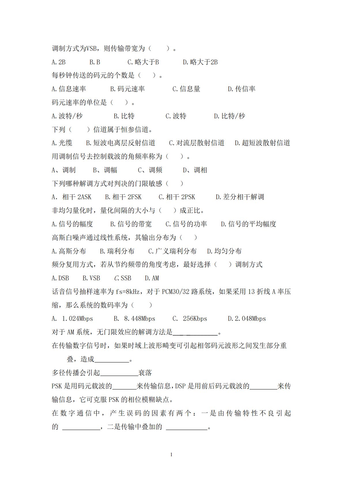 1调制方式为VSB,则传输带宽为()。A.2BB.BC.略大于BD.略大于2B每秒钟传送的码元的个数是()。A.信息速率B.码元速率C.信息量D.传信率码元速率的单位是()。A.波特/秒B.比特C.波特D.比特/秒下列()信道属于恒参信道。A.光缆B.短波电离层反射信道C.对流层散射信道D.超短波散射信道用调制信号去控制载波的角频率称为()。A、调制B、调幅C、调频D、调相下列哪种解调方式对判决的门限敏感()A.相干2ASKB.相干2FSKC.相干2PSKD.差分相干解调非均匀量化时,量化间隔的大小与()成正比。A.信号的幅度B.信号的带宽C.信号的功率D.信号的平均幅度高斯白噪声通过线性系统...