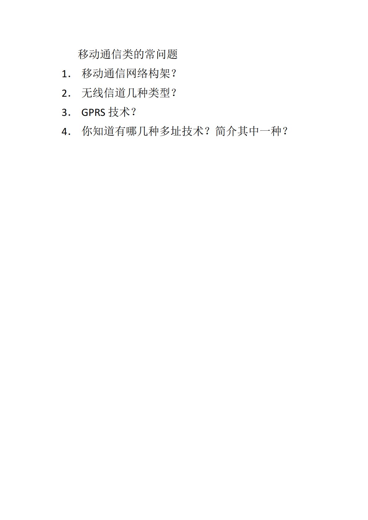 移动通信类的常问题1.移动通信网络构架?2.无线信道几种类型?3.GPRS技术?4.你知道有哪几种多址技术?简介其中一种?移动通信类的常问题1.移动通信网络构架?2.无线信道几种类型?3.GPRS技术?4.你知道有哪几种多址技术?简介其中一种?5.说出你所熟悉的几种数字调制技术?6.切换技术有哪几种?7.什么是天线?大致性能参数有哪些?8.简述移动通信的发展?9.TD-scdma的主要特点和核心技术?10.4G关键技术有哪些?11.IP核心网的大致定义?12.PSTN?13.频分双工?百校文库—海量高校资料共享库百校文库是一个线上大学生专业学习资料共享平台,致力于通过用户自主上传与分享,打造一...