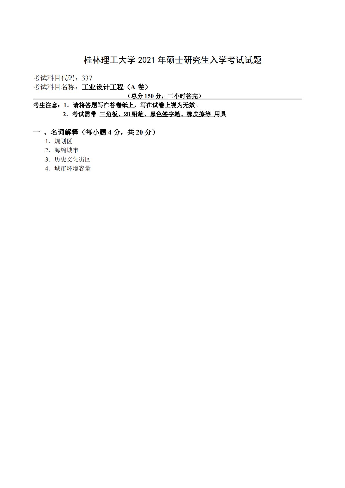 桂林理工大学2021年硕士研究生入学考试试题考试科目代码:337考试科目名称:工业设计工程(A卷)(总分150分,三小时答完)考生注意:1.请将答题写在答卷纸上,写在试卷上视为无效。2.考试需带三角板、2B铅笔、黑色签字笔、橡皮擦等用具一、名词解释(每小题4分,共20分)1.规划区2.海绵城市3.历史文化街区4.城市环境容量桂林理工大学2021年硕士研究生入学考试试题考试科目代码:337考试科目名称:工业设计工程(A卷)(总分150分,三小时答完)考生注意:1.请将答题写在答卷纸上,写在试卷上视为无效。2.考试需带三角板、2B铅笔、黑色签字笔、橡皮擦等用具一、名词解释(每小题4分,共20分)1...