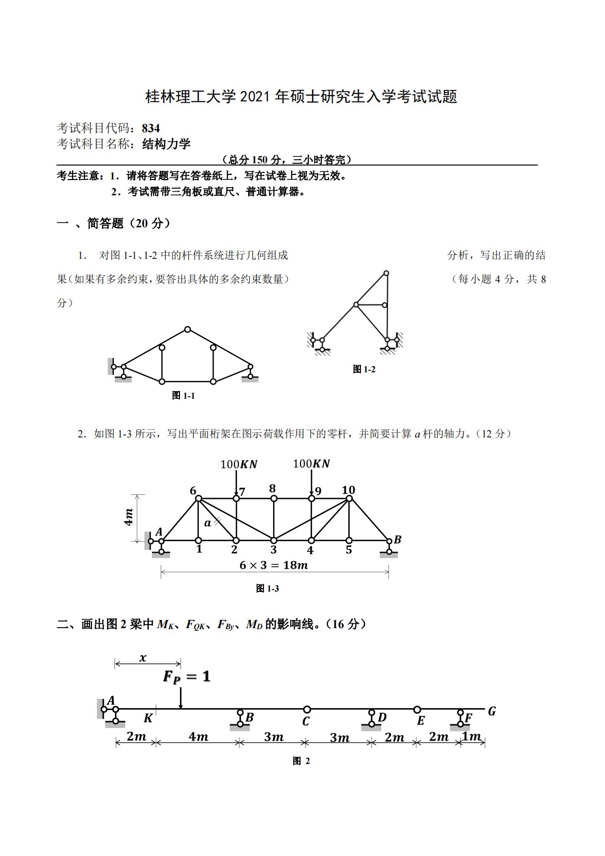 桂林理工大学2021年硕士研究生入学考试试题考试科目代码:834考试科目名称:结构力学(总分150分,三小时答完)考生注意:1.请将答题写在答卷纸上,写在试卷上视为无效。2.考试需带三角板或直尺、普通计算器。一、简答题(20分)分析,写出正确的结(每小题4分,共81.对图1-1、1-2中的杆件系统进行几何组成果(如果有多余约束,要答出具体的多余约束数量)分)2.如图1-3所示,写出平面桁架在图示荷载作用下的零杆,并简要计算a杆的轴力。(12分)二、画出图2梁中MK、FQK、FBy、MD的影响线。(16分)图1-1图1-2图1-3图2三、不需要写出详细求解过程,作图3结构的弯矩图、剪力图和轴力图...