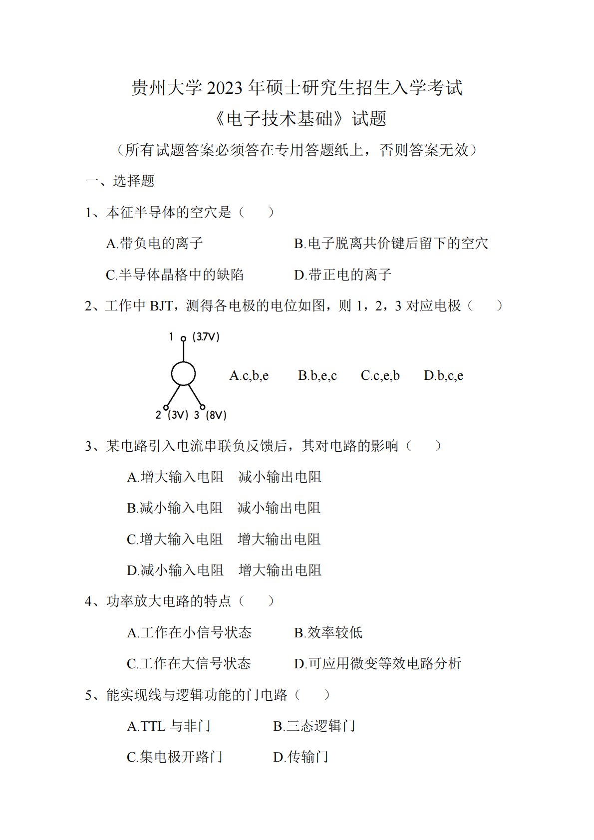贵州大学2023年硕士研究生招生入学考试《电子技术基础》试题(所有试题答案必须答在专用答题纸上,否则答案无效)一、选择题1、本征半导体的空穴是()A.带负电的离子B.电子脱离共价键后留下的空穴C.半导体晶格中的缺陷D.带正电的离子2、工作中BJT,测得各电极的电位如图,则1,2,3对应电极()A.c,b,eB.b,e,cC.c,e,bD.b,c,e3、某电路引入电流串联负反馈后,其对电路的影响()A.增大输入电阻减小输出电阻B.减小输入电阻减小输出电阻C.增大输入电阻增大输出电阻D.减小输入电阻增大输出电阻4、功率放大电路的特点()A.工作在小信号状态B.效率较低C.工作在大信号状态D.可应用...