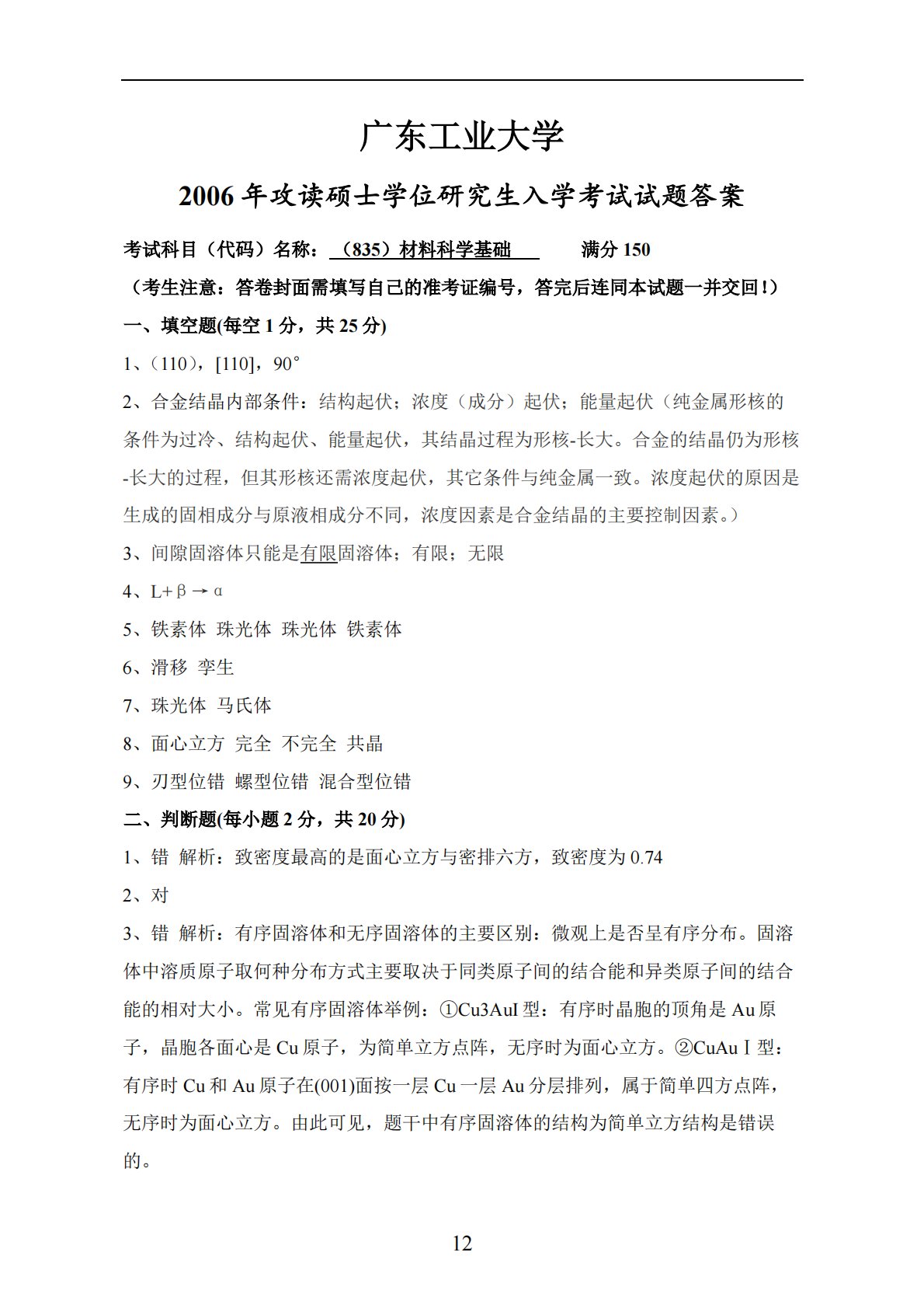 12广东工业大学2006年攻读硕士学位研究生入学考试试题答案考试科目(代码)名称:(835)材料科学基础满分150(考生注意:答卷封面需填写自己的准考证编号,答完后连同本试题一并交回!)一、填空题(每空1分,共25分)1、(110),[110],90°2、合金结晶内部条件:结构起伏;浓度(成分)起伏;能量起伏(纯金属形核的条件为过冷、结构起伏、能量起伏,其结晶过程为形核-长大。合金的结晶仍为形核-长大的过程,但其形核还需浓度起伏,其它条件与纯金属一致。浓度起伏的原因是生成的固相成分与原液相成分不同,浓度因素是合金结晶的主要控制因素。)3、间隙固溶体只能是有限固溶体;有限;无限4、L+β→α5、...