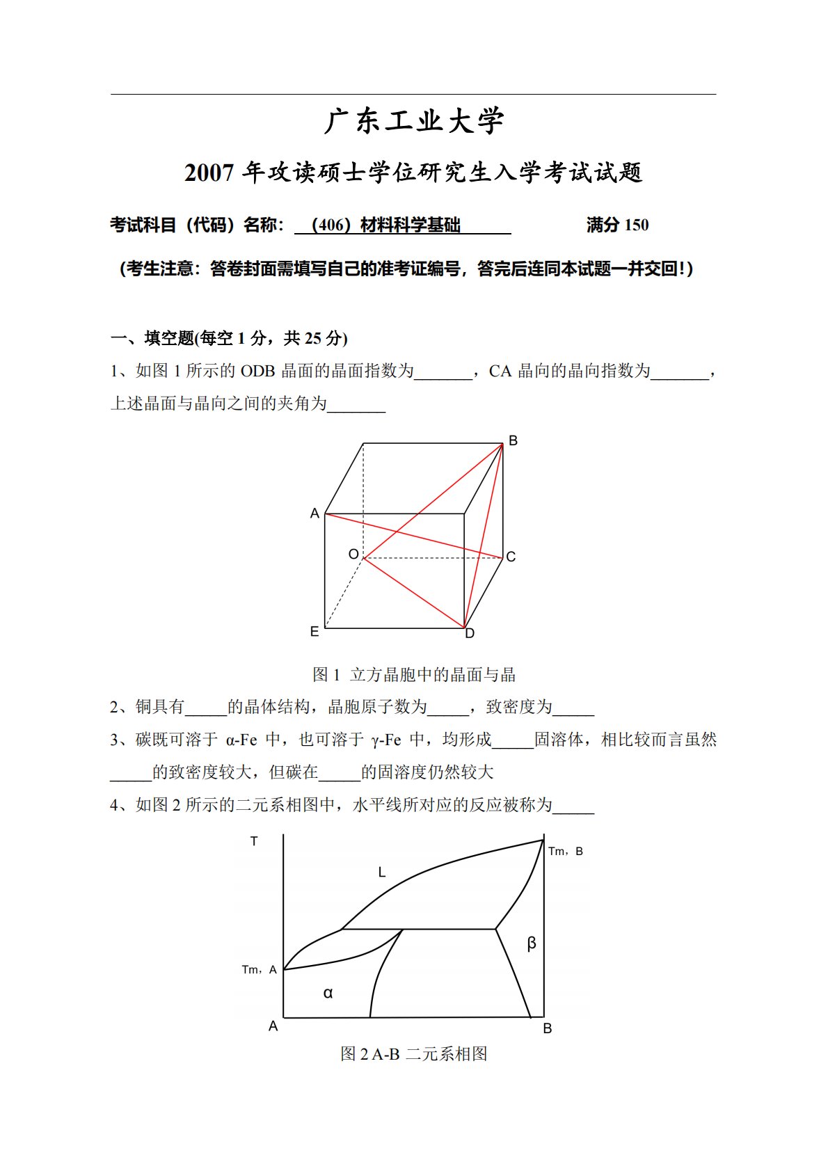 广东工业大学2007年攻读硕士学位研究生入学考试试题考试科目(代码)名称:(406)材料科学基础满分150(考生注意:答卷封面需填写自己的准考证编号,答完后连同本试题一并交回!)一、填空题(每空1分,共25分)1、如图1所示的ODB晶面的晶面指数为_______,CA晶向的晶向指数为_______,上述晶面与晶向之间的夹角为_______图1立方晶胞中的晶面与晶2、铜具有_____的晶体结构,晶胞原子数为_____,致密度为_____3、碳既可溶于α-Fe中,也可溶于γ-Fe中,均形成_____固溶体,相比较而言虽然_____的致密度较大,但碳在_____的固溶度仍然较大4、如图2所示的二元系...