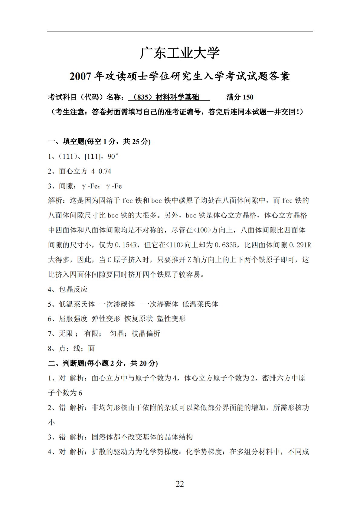22广东工业大学2007年攻读硕士学位研究生入学考试试题答案考试科目(代码)名称:(835)材料科学基础满分150(考生注意:答卷封面需填写自己的准考证编号,答完后连同本试题一并交回!)一、填空题(每空1分,共25分)1、(11̅1)、[11̅1],90°2、面心立方40.743、间隙;γ-Fe;γ-Fe解析:这是因为固溶于fcc铁和bcc铁中碳原子均处在八面体间隙中,而fcc铁的八面体间隙尺寸比bcc铁的大很多。另外,bcc铁是体心立方晶格,体心立方晶格中四面体和八面体间隙均是不对称的,尽管在方向上,八面体间隙比四面体间隙的尺寸小,仅为0.154R,但它在向上却为0.633R,比四面体间隙0...