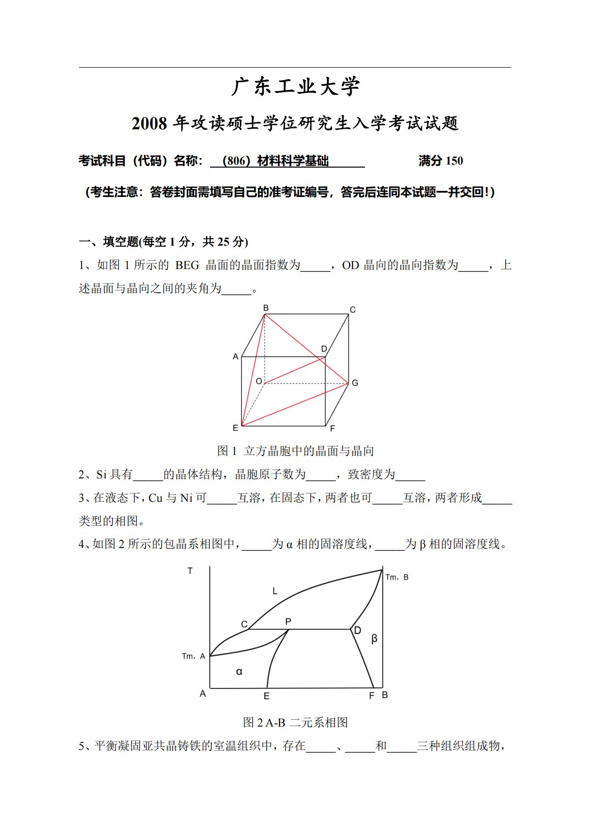广东工业大学2008年攻读硕士学位研究生入学考试试题考试科目(代码)名称:(806)材料科学基础满分150(考生注意:答卷封面需填写自己的准考证编号,答完后连同本试题一并交回!)一、填空题(每空1分,共25分)1、如图1所示的BEG晶面的晶面指数为_____,OD晶向的晶向指数为_____,上述晶面与晶向之间的夹角为_____。图1立方晶胞中的晶面与晶向2、Si具有_____的晶体结构,晶胞原子数为_____,致密度为_____3、在液态下,Cu与Ni可_____互溶,在固态下,两者也可_____互溶,两者形成_____类型的相图。4、如图2所示的包晶系相图中,_____为α相的固溶度线,__...