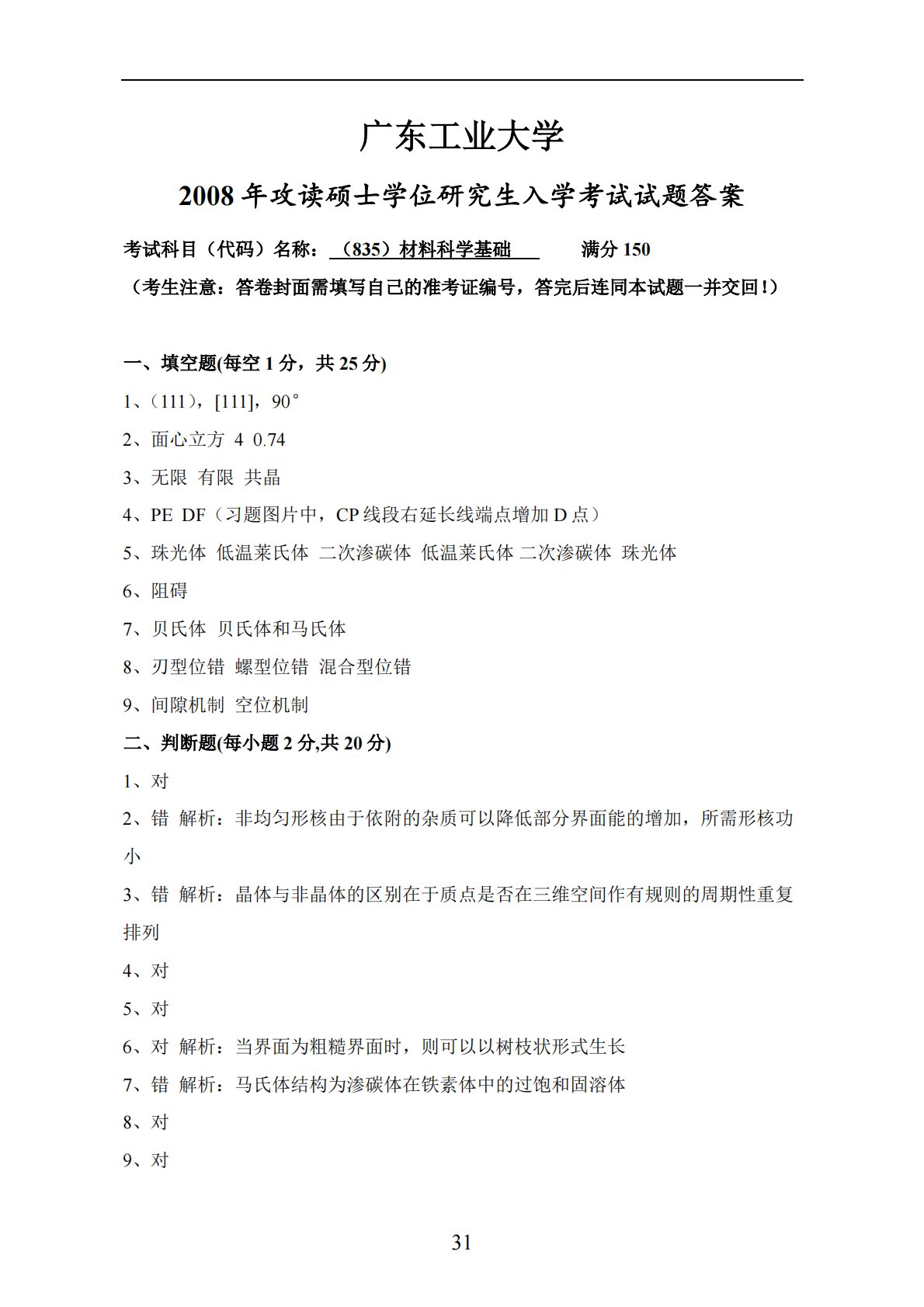 31广东工业大学2008年攻读硕士学位研究生入学考试试题答案考试科目(代码)名称:(835)材料科学基础满分150(考生注意:答卷封面需填写自己的准考证编号,答完后连同本试题一并交回!)一、填空题(每空1分,共25分)1、(111),[111],90°2、面心立方40.743、无限有限共晶4、PEDF(习题图片中,CP线段右延长线端点增加D点)5、珠光体低温莱氏体二次渗碳体低温莱氏体二次渗碳体珠光体6、阻碍7、贝氏体贝氏体和马氏体8、刃型位错螺型位错混合型位错9、间隙机制空位机制二、判断题(每小题2分,共20分)1、对2、错解析:非均匀形核由于依附的杂质可以降低部分界面能的增加,所需形核功小3...