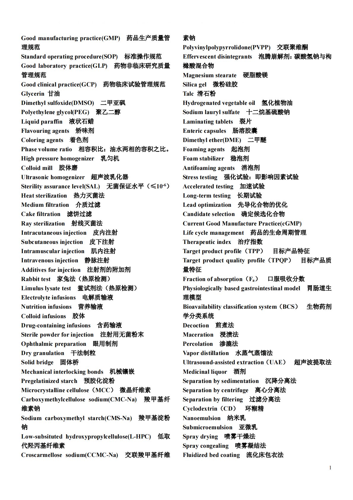 不定期更新大学学习资料,微信公众号:大学资源库,新浪微博:大学资源库,QQ:8351599731Goodmanufacturingpractice(GMP)药品生产质量管理规范Standardoperatingprocedure(SOP)标准操作规范Goodlaboratorypractice(GLP)药物非临床研究质量管理规范Goodclinicalpractice(GCP)药物临床试验管理规范Glycerin甘油Dimethylsulfoxide(DMSO)二甲亚砜Polyethyleneglycol(PEG)聚乙二醇Liquidparaffin液状石蜡Flavouringagents矫味...