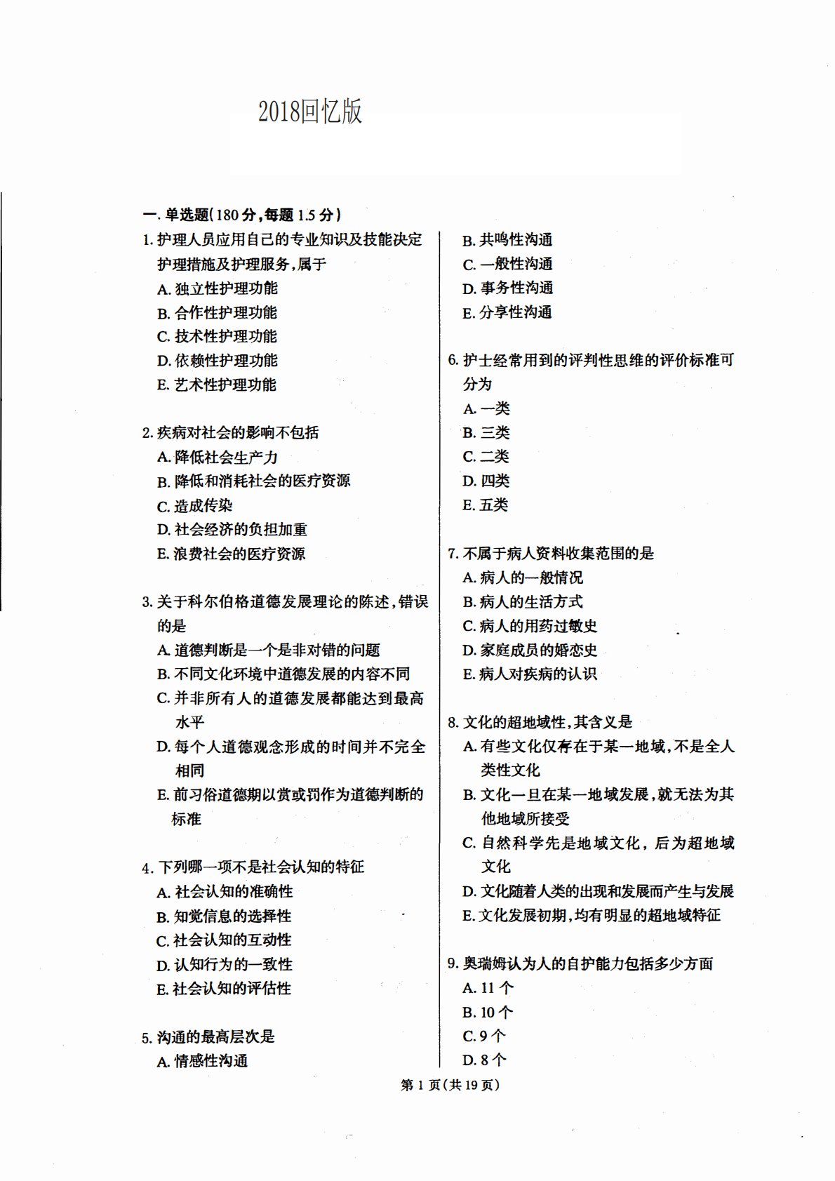 201118一.单选题(180分,每题1.5分)1.护理人员应用自己的专业知识及技能决定护理措施及护理服务,属千A.独立性护理功能B.合作性护理功能C.技术性护理功能D.依赖性护理功能E艺术性护理功能2.疾病对社会的影响不包括A.降低社会生产力B.降低和消耗社会的医疗资源C.造成传染D.社会经济的负担加重E浪费社会的医疗资源3.关于科尔伯格道德发展理论的陈述,错误的是A.道德判断是一个是非对错的问题B.不同文化环境中道德发展的内容不同C.并非所有人的道德发展都能达到最高水平D.每个人道德观念形成的时间并不完全相同E.前习俗道德期以赏或罚作为道德判断的标准4.下列哪一项不是社会认知的特征A.社会...