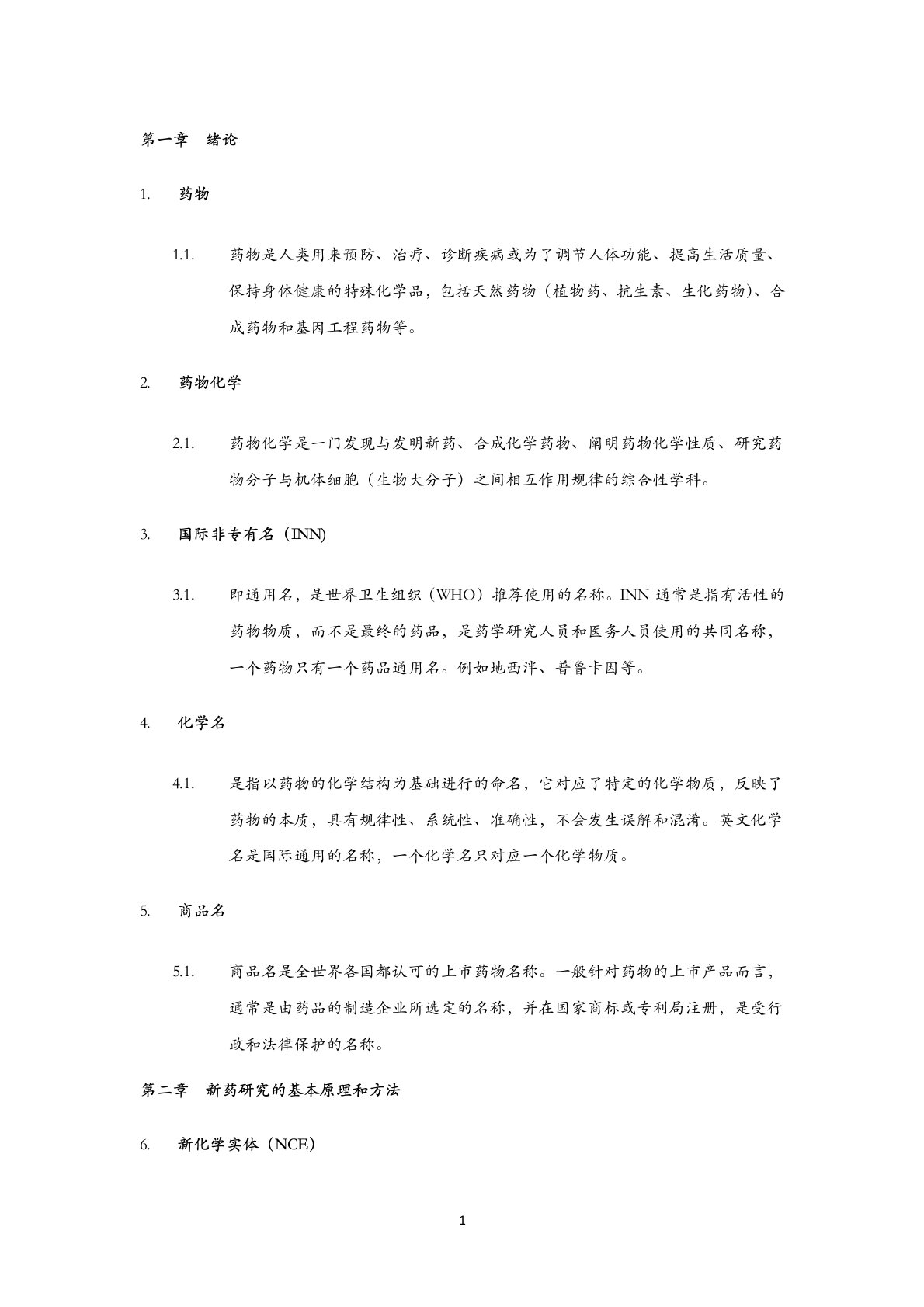 第一章绪论药物药物化学国际非专有名(INN)化学名商品名第二章新药研究的基本原理和方法新化学实体(NCE)脂水分配系数(P)结构特异性药物结构非特异性药物药效构象构象等效性先导化合物先导化合物的优化合理药物设计组合化学高通量筛选生物电子等排体前药载体前药生物前体药物潜伏化软药硬药孪药定量构效关系(QSAR)计算机辅助药物设计直接药物设计间接药物设计活性构象药效团第三章药物的代谢反应药物代谢官能团化反应第Ⅰ相生物转化第Ⅱ相生物转化第四章中枢神经系统药物中枢神经系统药物镇静催眠药苯二氮卓类药物巴比妥类药物镇痛药内酰胺-内酰亚胺醇互变异构血脑屏障选择性5-羟色胺再摄取抑制剂去甲肾上腺素重摄取抑制剂单...