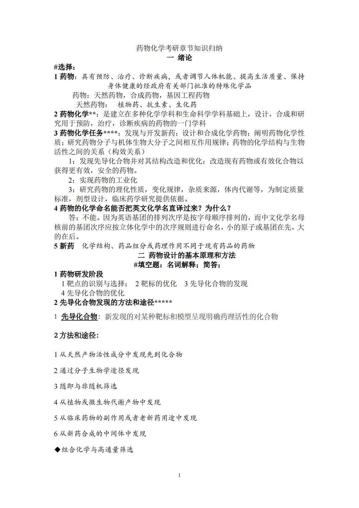 1药物化学考研章节知识归纳一绪论#选择:1药物:具有预防、治疗、诊断疾病,或者调节人体机能、提高生活质量、保持身体健康的经政府有关部门批准的特殊化学品药物:天然药物,合成药物,基因工程药物天然药物:植物药、抗生素、生化药2药物化学**:是建立在多种化学学科和生命科学学科基础上,设计,合成和研究用于预防,治疗,诊断疾病的药物的一门学科3药物化学任务****:发现与开发新药;设计和合成化学药物;阐明药物化学性质;研究药物分子与机体生物大分子之间相互作用规律;药物的化学结构与生物活性之间的关系(构效关系)1;发现先导化合物并对其结构改造和优化;改造现有药物或有效化合物以获得更有效,安全的药物。2;实...