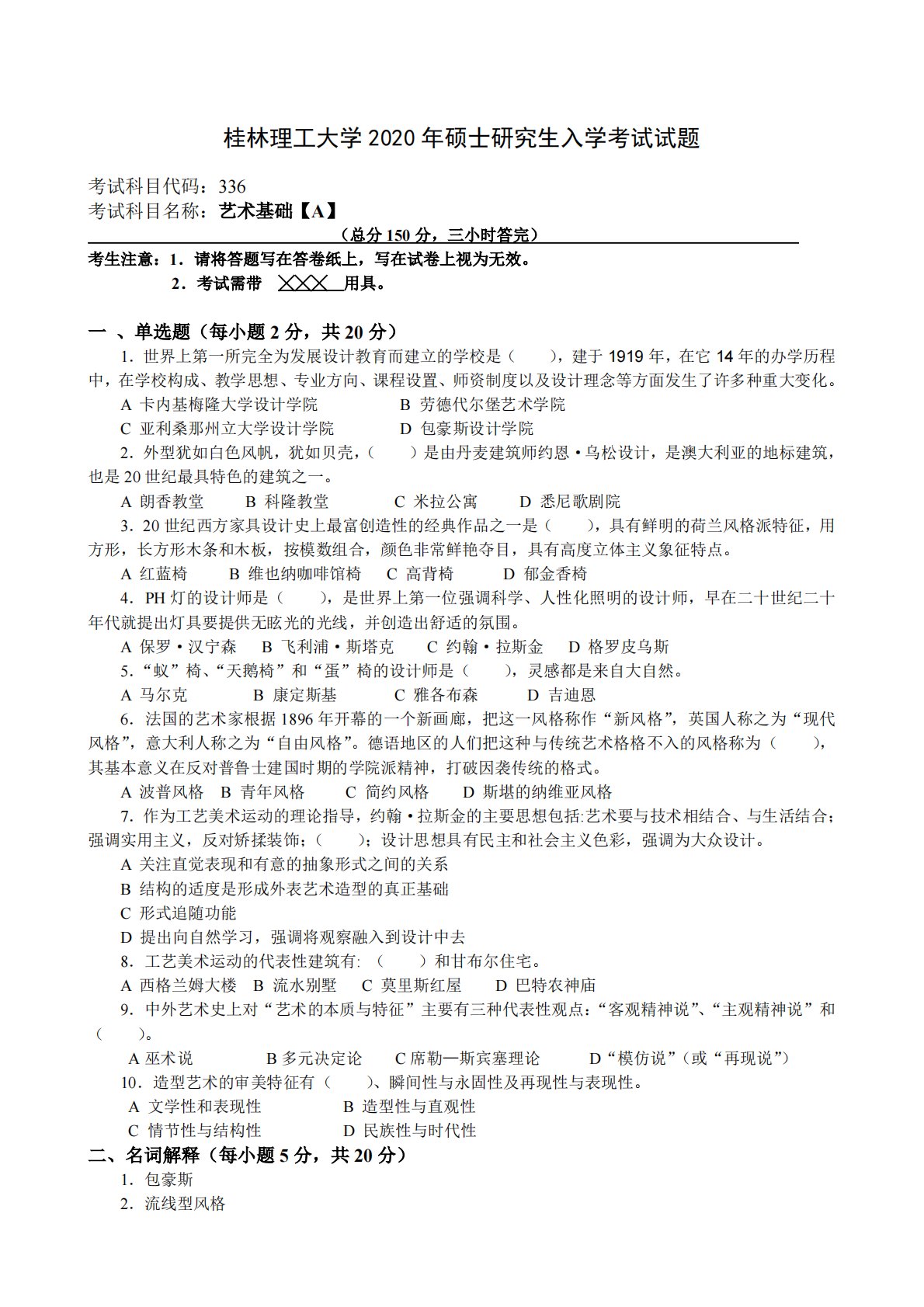 桂林理工大学2020年硕士研究生入学考试试题考试科目代码:336考试科目名称:艺术基础【A】(总分150分,三小时答完)考生注意:1.请将答题写在答卷纸上,写在试卷上视为无效。2.考试需带╳╳╳用具。一、单选题(每小题2分,共20分)1.世界上第一所完全为发展设计教育而建立的学校是(),建于1919年,在它14年的办学历程中,在学校构成、教学思想、专业方向、课程设置、师资制度以及设计理念等方面发生了许多种重大变化。A卡内基梅隆大学设计学院C亚利桑那州立大学设计学院B劳德代尔堡艺术学院D包豪斯设计学院)是由丹麦建筑师约恩·乌松设计,是澳大利亚的地标建筑,2.外型犹如白色风帆,犹如贝壳,(也是20...