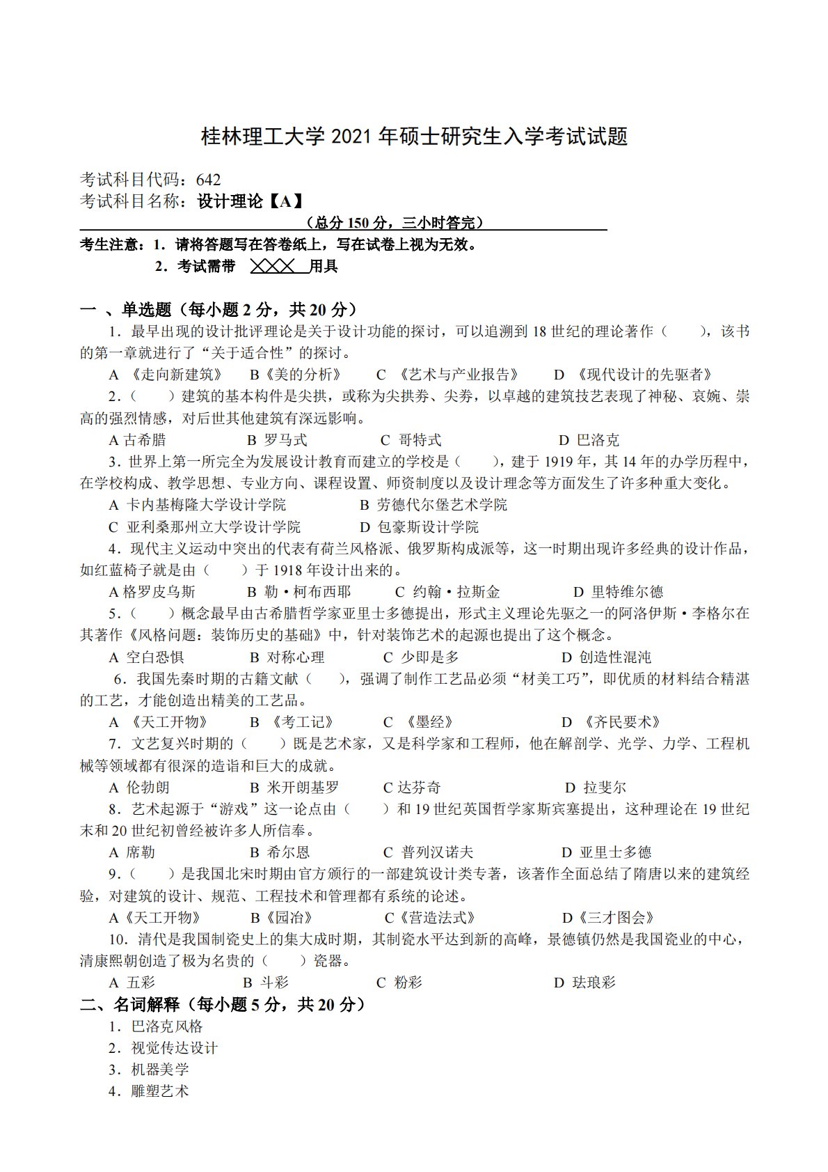 桂林理工大学2021年硕士研究生入学考试试题考试科目代码:642考试科目名称:设计理论【A】(总分150分,三小时答完)考生注意:1.请将答题写在答卷纸上,写在试卷上视为无效。2.考试需带╳╳╳用具一、单选题(每小题2分,共20分)),该书1.最早出现的设计批评理论是关于设计功能的探讨,可以追溯到18世纪的理论著作(的第一章就进行了“关于适合性”的探讨。A《走向新建筑》B《美的分析》C《艺术与产业报告》D《现代设计的先驱者》2.()建筑的基本构件是尖拱,或称为尖拱劵、尖劵,以卓越的建筑技艺表现了神秘、哀婉、崇高的强烈情感,对后世其他建筑有深远影响。A古希腊B罗马式C哥特式3.世界上第一所完全为...