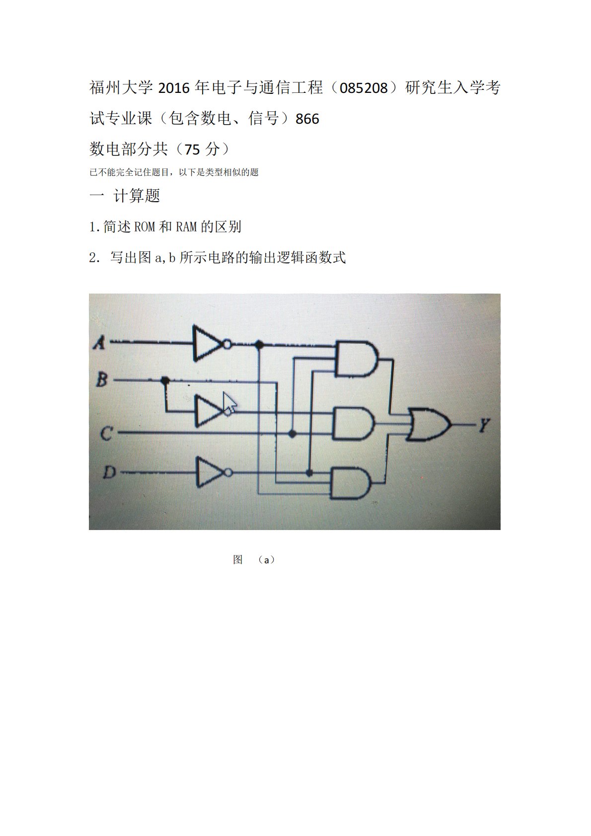 福州大学2016年电子与通信工程(085208)研究生入学考试专业课(包含数电、信号)866数电部分共(75分)已不能完全记住题目,以下是类型相似的题一计算题1.简述ROM和RAM的区别2.写出图a,b所示电路的输出逻辑函数式图(a)图(b)3.写出图C卡诺图的逻辑表达式二.门电路(考题和这道几乎一样,10分)三、组合逻辑电路和时序逻辑电路综合1.(这次好像和例4.3.6差不多)试用8选一数据选择器产生三变量逻辑函数。Z=AˊBˊCˊ+AC+AˊBC2.有道考题是写驱动方程,状态方程和输出方程。四、555定时器(555每年都特别重要,今年大约有三道555的题),有两个题和课后题10.20和10...