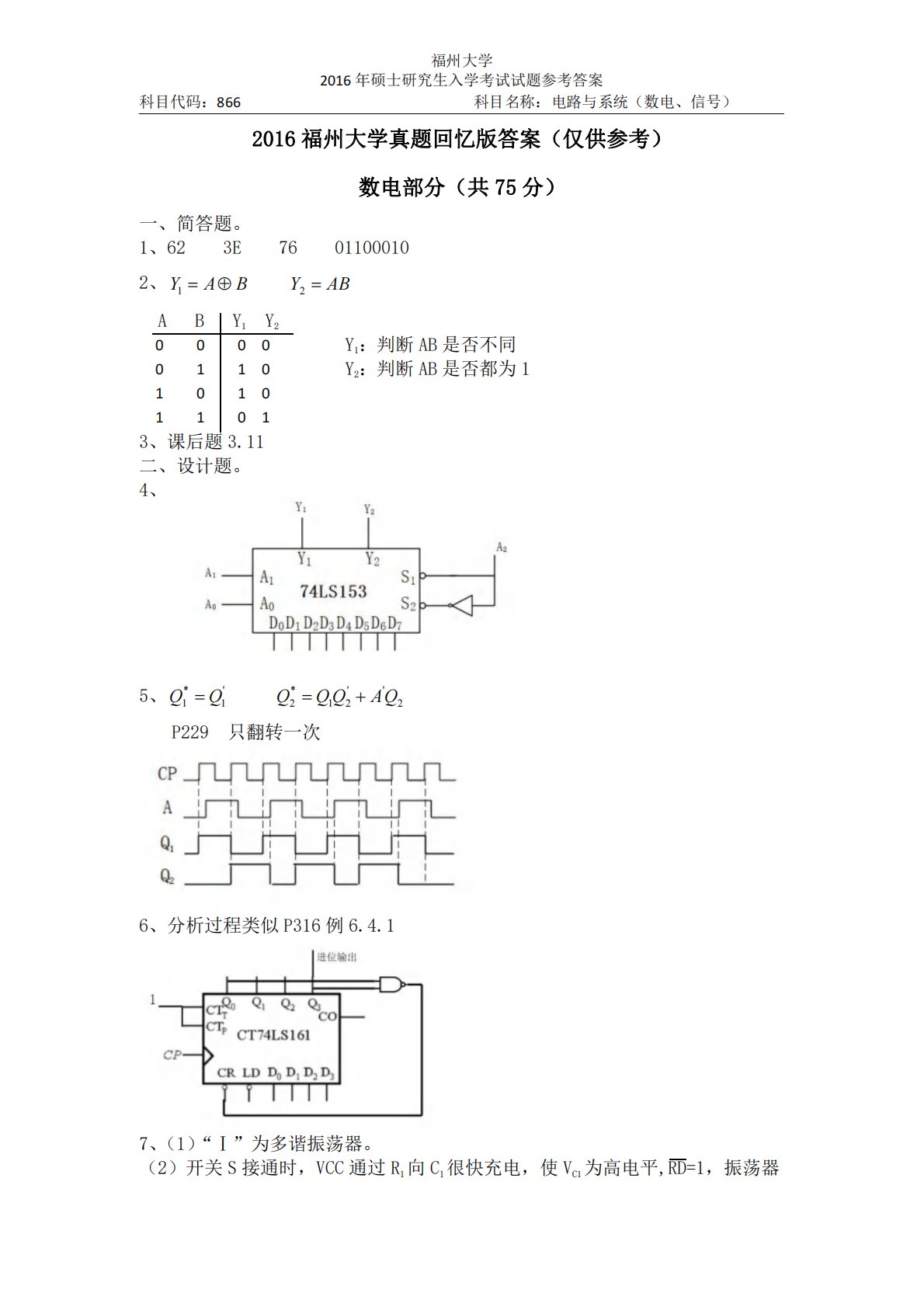 福州大学2016年硕士研究生入学考试试题参考答案科目代码:866科目名称:电路与系统(数电、信号)2016福州大学真题回忆版答案(仅供参考)数电部分(共75分)一、简答题。1、623E76011000102、BAY1ABY2ABY1Y200000110101011013、课后题3.11二、设计题。4、5、'1*1QQ2''21*2QAQQQP229只翻转一次6、分析过程类似P316例6.4.17、(1)“Ⅰ”为多谐振荡器。(2)开关S接通时,VCC通过R1向C1很快充电,使VC1为高电平,RD=1,振荡器Y1:判断AB是否不同Y2:判断AB是否都为1福州大学2016年硕士研究生入学...