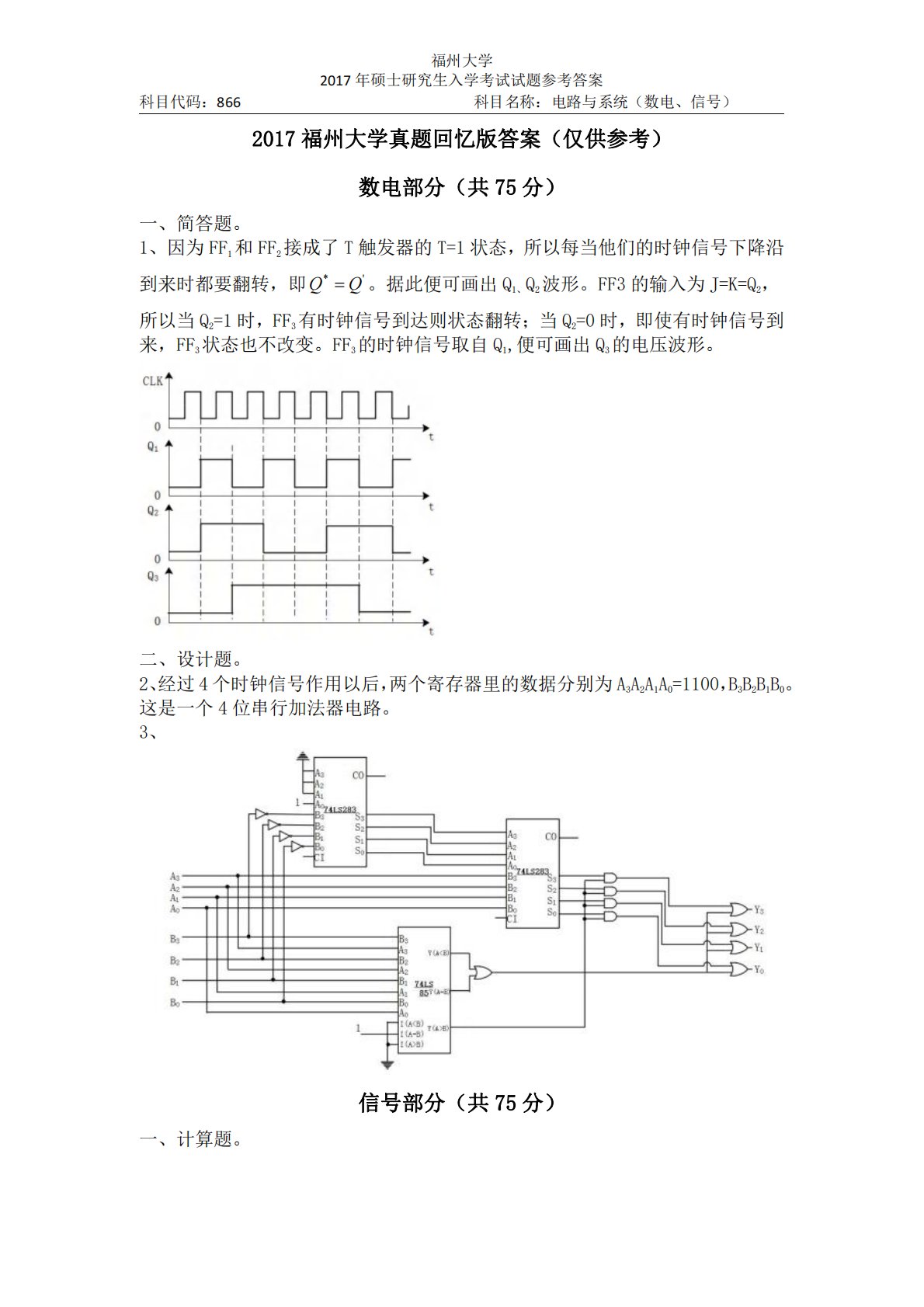 福州大学2017年硕士研究生入学考试试题参考答案科目代码:866科目名称:电路与系统(数电、信号)2017福州大学真题回忆版答案(仅供参考)数电部分(共75分)一、简答题。1、因为FF1和FF2接成了T触发器的T=1状态,所以每当他们的时钟信号下降沿到来时都要翻转,即'*QQ。据此便可画出Q1、Q2波形。FF3的输入为J=K=Q2,所以当Q2=1时,FF3有时钟信号到达则状态翻转;当Q2=0时,即使有时钟信号到来,FF3状态也不改变。FF3的时钟信号取自Q1,便可画出Q3的电压波形。二、设计题。2、经过4个时钟信号作用以后,两个寄存器里的数据分别为A3A2A1A0=1100,B3B2B1B0...