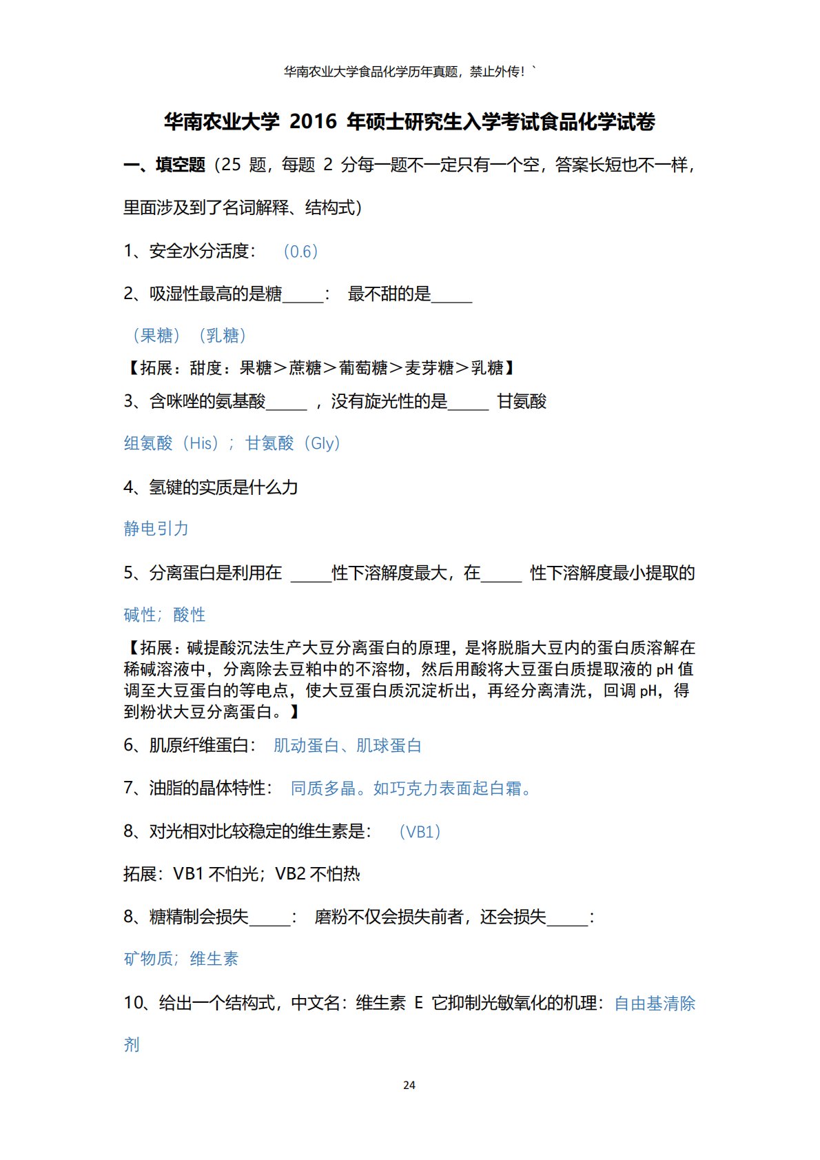 华南农业大学食品化学历年真题,禁止外传!`24华南农业大学2016年硕士研究生入学考试食品化学试卷一、填空题(25题,每题2分每一题不一定只有一个空,答案长短也不一样,里面涉及到了名词解释、结构式)1、安全水分活度:(0.6)2、吸湿性最高的是糖:最不甜的是(果糖)(乳糖)【拓展:甜度:果糖>蔗糖>葡萄糖>麦芽糖>乳糖】3、含咪唑的氨基酸,没有旋光性的是甘氨酸组氨酸(His);甘氨酸(Gly)4、氢键的实质是什么力静电引力5、分离蛋白是利用在性下溶解度最大,在性下溶解度最小提取的碱性;酸性【拓展:碱提酸沉法生产大豆分离蛋白的原理,是将脱脂大豆内的蛋白质溶解在稀碱溶液中,分离除去豆粕中的不溶物,...