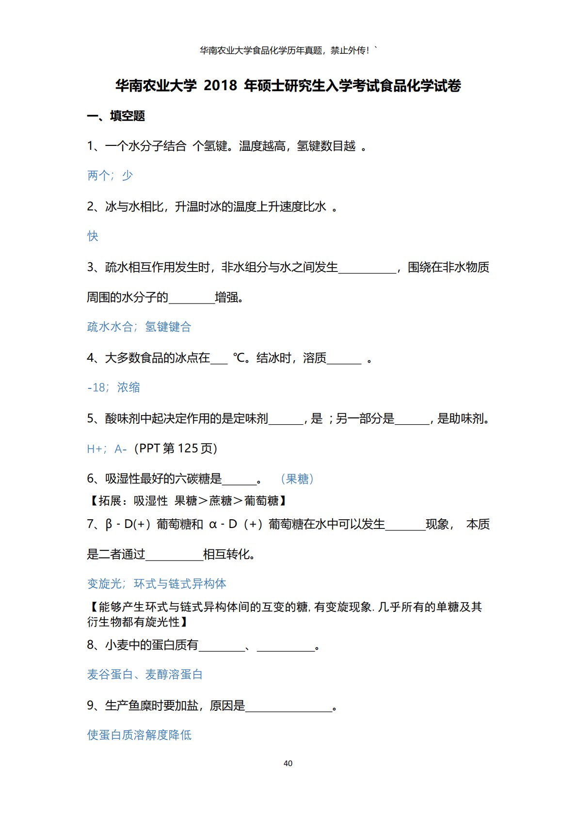华南农业大学食品化学历年真题,禁止外传!`40华南农业大学2018年硕士研究生入学考试食品化学试卷一、填空题1、一个水分子结合个氢键。温度越高,氢键数目越。两个;少2、冰与水相比,升温时冰的温度上升速度比水。快3、疏水相互作用发生时,非水组分与水之间发生,围绕在非水物质周围的水分子的增强。疏水水合;氢键键合4、大多数食品的冰点在℃。结冰时,溶质。-18;浓缩5、酸味剂中起决定作用的是定味剂,是;另一部分是,是助味剂。H+;A-(PPT第125页)6、吸湿性最好的六碳糖是。(果糖)【拓展:吸湿性果糖>蔗糖>葡萄糖】7、β﹣D(+)葡萄糖和α﹣D(+)葡萄糖在水中可以发生现象,本质是二者通过相互转...