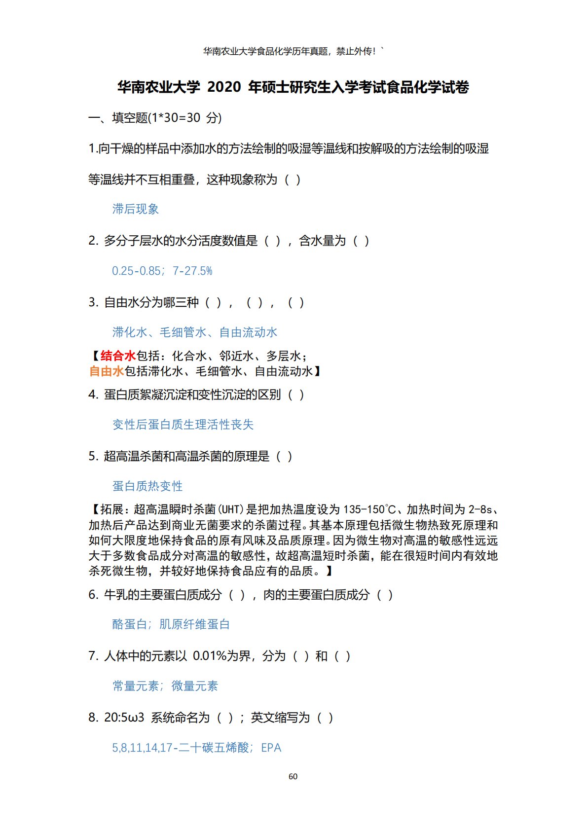 华南农业大学食品化学历年真题,禁止外传!`60华南农业大学2020年硕士研究生入学考试食品化学试卷一、填空题(1*30=30分)1.向干燥的样品中添加水的方法绘制的吸湿等温线和按解吸的方法绘制的吸湿等温线并不互相重叠,这种现象称为()滞后现象2.多分子层水的水分活度数值是(),含水量为()0.25-0.85;7-27.5%3.自由水分为哪三种(),(),()滞化水、毛细管水、自由流动水【结合水包括:化合水、邻近水、多层水;自由水包括滞化水、毛细管水、自由流动水】4.蛋白质絮凝沉淀和变性沉淀的区别()变性后蛋白质生理活性丧失5.超高温杀菌和高温杀菌的原理是()蛋白质热变性【拓展:超高温瞬时杀菌(...