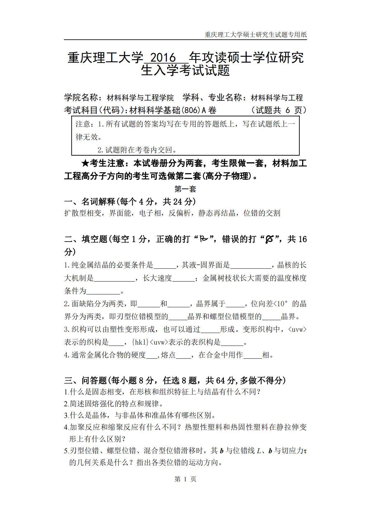 重庆理工大学硕士研究生试题专用纸第1页重庆理工大学2016年攻读硕士学位研究生入学考试试题学院名称:材料科学与工程学院学科、专业名称:材料科学与工程考试科目(代码):材料科学基础(806)A卷(试题共6页)注意:1.所有试题的答案均写在专用的答题纸上,写在试题纸上一律无效。2.试题附在考卷内交回。★考生注意:本试卷册分为两套,考生限做一套,材料加工工程高分子方向的考生可选做第二套(高分子物理)。第一套一、名词解释(每个4分,共24分)扩散型相变,界面能,电子相,反偏析,静态再结晶,位错的交割二、填空题(每空1分,正确的打“”,错误的打“”,共16分)1.纯金属结晶的必要条件是,其液-固界面...