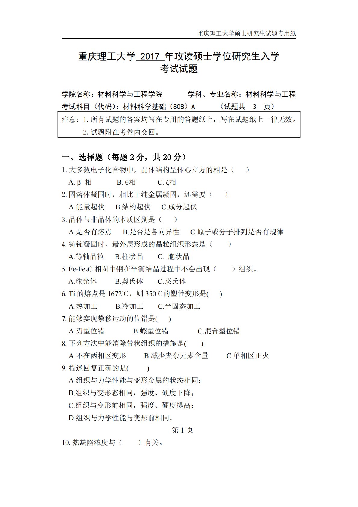 重庆理工大学硕士研究生试题专用纸重庆理工大学2017年攻读硕士学位研究生入学考试试题学院名称:材料科学与工程学院学科、专业名称:材料科学与工程考试科目(代码):材料科学基础(808)A(试题共3页)注意:1.所有试题的答案均写在专用的答题纸上,写在试题纸上一律无效。2.试题附在考卷内交回。一、选择题(每题2分,共20分)1.大多数电子化合物中,晶体结构呈体心立方的相是()A.β相B.θ相C.ζ相2.固溶体凝固时,相比于纯金属凝固,还需要()A.能量起伏B.结构起伏C.成分起伏3.晶体与非晶体的本质区别是()A.是否有熔点B.是否是各向异性C.原子或分子排列是否有规律4.铸锭凝固时,最外层形成的...