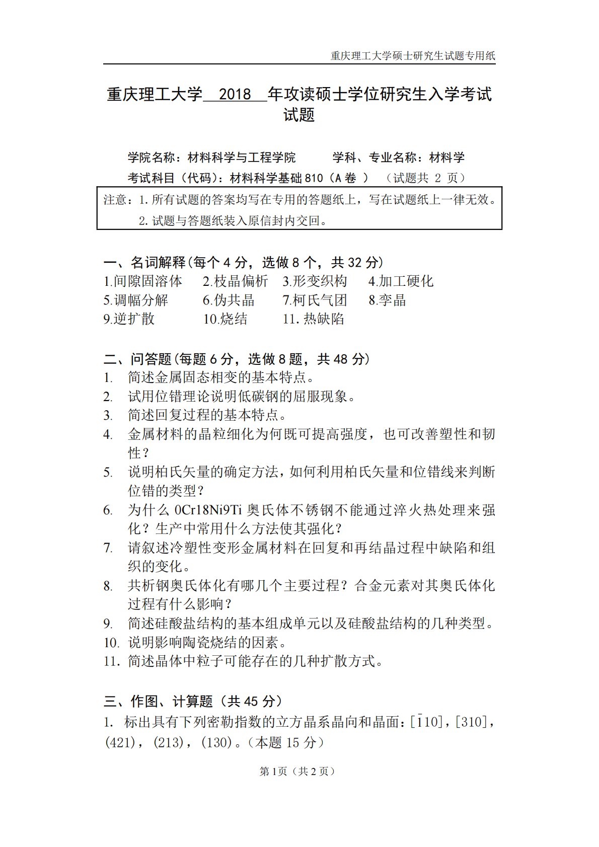 重庆理工大学硕士研究生试题专用纸第1页(共2页)重庆理工大学2018年攻读硕士学位研究生入学考试试题学院名称:材料科学与工程学院学科、专业名称:材料学考试科目(代码):材料科学基础810(A卷)(试题共2页)注意:1.所有试题的答案均写在专用的答题纸上,写在试题纸上一律无效。2.试题与答题纸装入原信封内交回。一、名词解释(每个4分,选做8个,共32分)1.间隙固溶体2.枝晶偏析3.形变织构4.加工硬化5.调幅分解6.伪共晶7.柯氏气团8.孪晶9.逆扩散10.烧结11.热缺陷二、问答题(每题6分,选做8题,共48分)1.简述金属固态相变的基本特点。2.试用位错理论说明低碳钢的屈服现象。3.简述回...