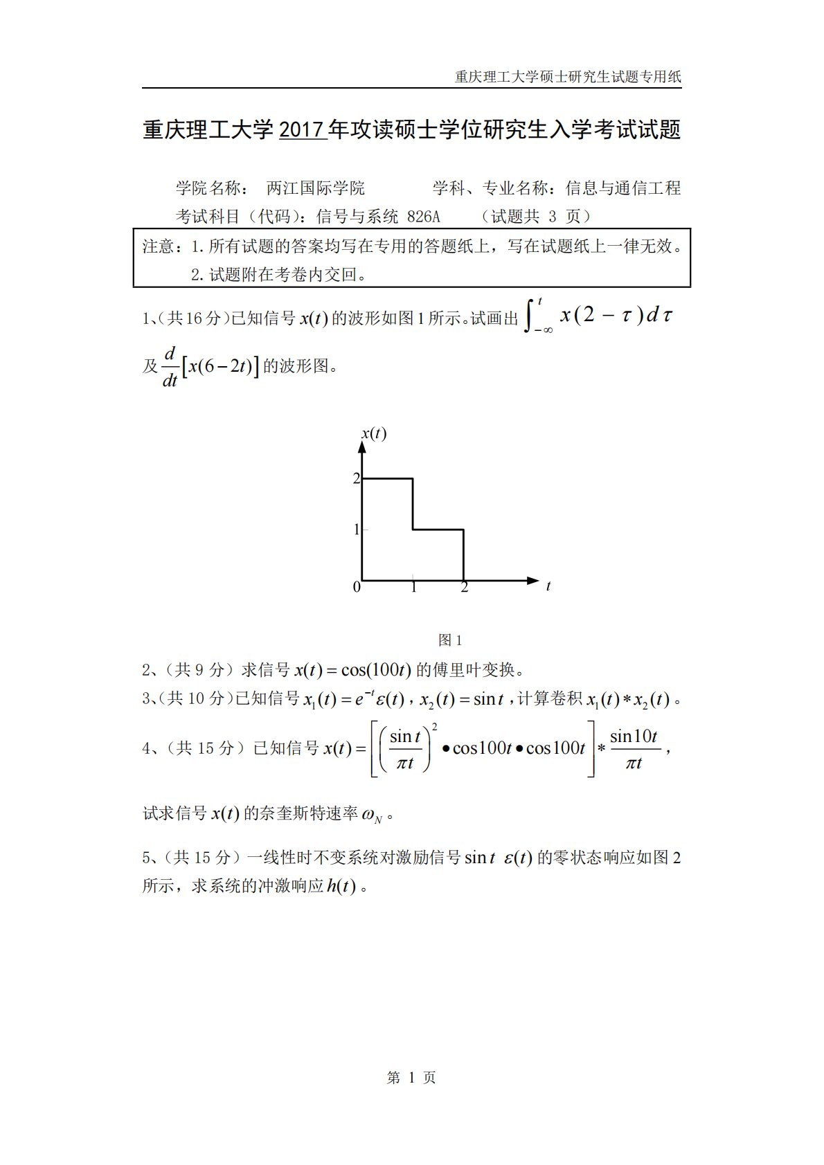 重庆理工大学硕士研究生试题专用纸第1页重庆理工大学2017年攻读硕士学位研究生入学考试试题学院名称:两江国际学院学科、专业名称:信息与通信工程考试科目(代码):信号与系统826A(试题共3页)注意:1.所有试题的答案均写在专用的答题纸上,写在试题纸上一律无效。2.试题附在考卷内交回。1、(共16分)已知信号()xt的波形如图1所示。试画出(2)txd及(62)dxtdt的波形图。图12、(共9分)求信号()cos(100)xtt的傅里叶变换。3、(共10分)已知信号1()()txtet,2()sinxtt,计算卷积12()()xtxt。4、(共15分)已知信号2s...