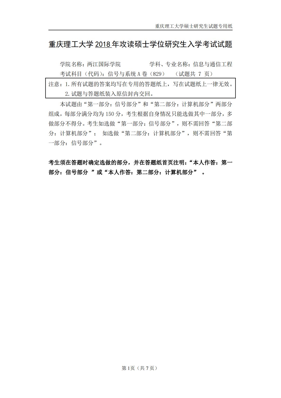 重庆理工大学硕士研究生试题专用纸第1页(共7页)重庆理工大学2018年攻读硕士学位研究生入学考试试题学院名称:两江国际学院学科、专业名称:信息与通信工程考试科目(代码):信号与系统A卷(829)(试题共7页)注意:1.所有试题的答案均写在专用的答题纸上,写在试题纸上一律无效。2.试题与答题纸装入原信封内交回。本试题由“第一部分:信号部分”和“第二部分:计算机部分”两部分组成,每部分满分均为150分,考生根据自身情况只能选做其中一部分,多做部分不得分。考生如选做“第一部分:信号部分”,则不需回答“第二部分:计算机部分”;如选做“第二部分:计算机部分”,则不需回答“第一部分:信号部分”。考生须在答...
