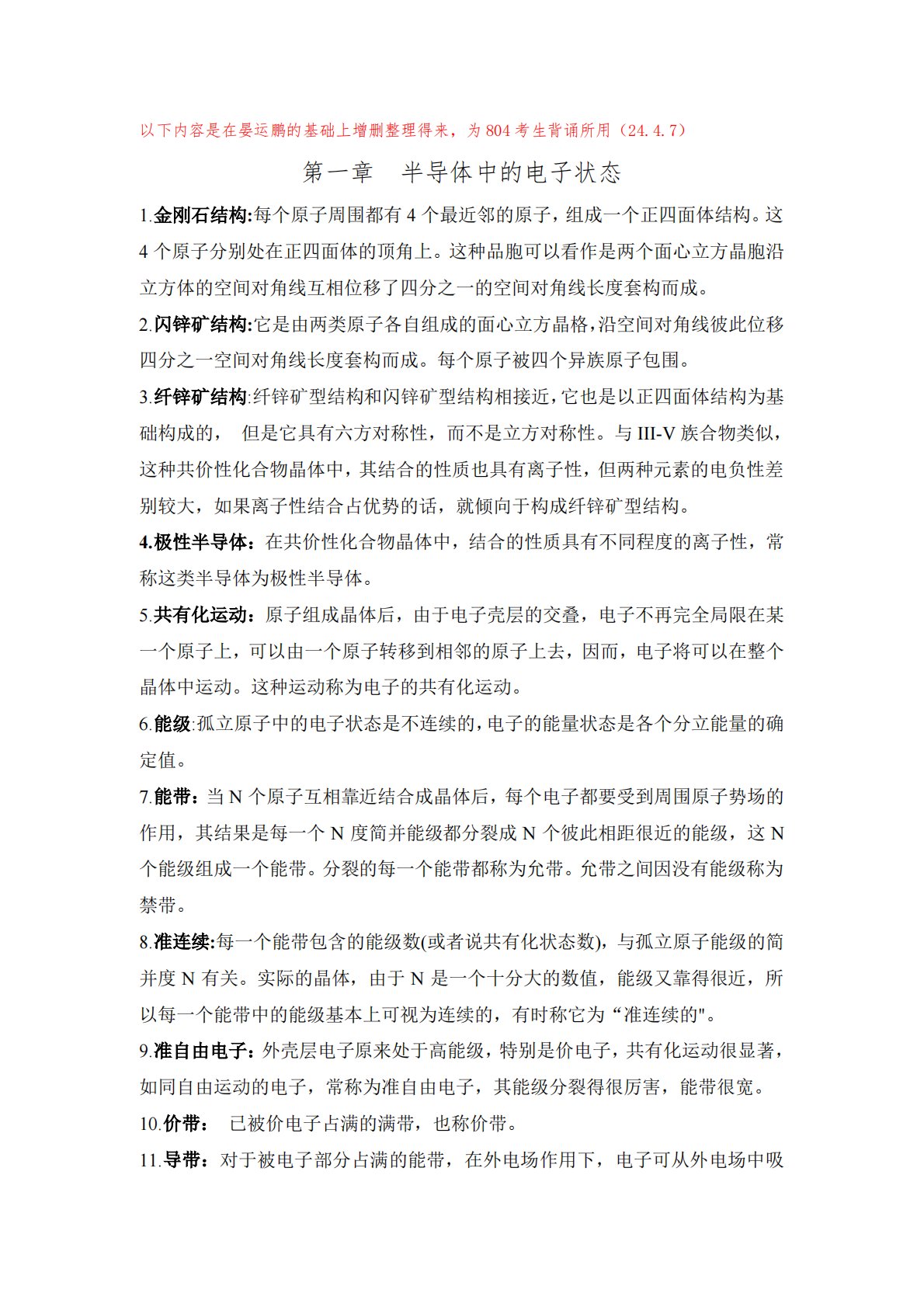 以下内容是在晏运鹏的基础上增删整理得来,为804考生背诵所用(24.4.7)第一章半导体中的电子状态1.金刚石结构:每个原子周围都有4个最近邻的原子,组成一个正四面体结构。这4个原子分别处在正四面体的顶角上。这种品胞可以看作是两个面心立方晶胞沿立方体的空间对角线互相位移了四分之一的空间对角线长度套构而成。2.闪锌矿结构:它是由两类原子各自组成的面心立方晶格,沿空间对角线彼此位移四分之一空间对角线长度套构而成。每个原子被四个异族原子包围。3.纤锌矿结构:纤锌矿型结构和闪锌矿型结构相接近,它也是以正四面体结构为基础构成的,但是它具有六方对称性,而不是立方对称性。与III-V族合物类似,这种共价性化...
