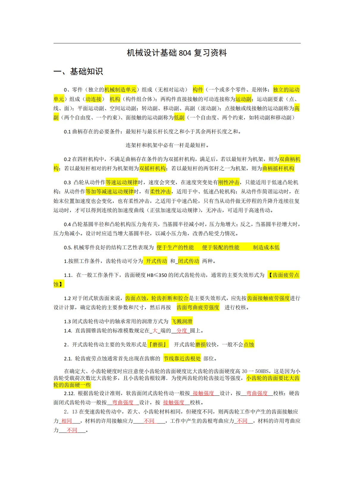 机械设计基础804复习资料一、基础知识0、零件(独立的机械制造单元)组成(无相对运动)构件(一个或多个零件、是刚体;独立的运动单元)组成(动连接)机构(构件组合体);两构件直接接触的可动连接称为运动副;运动副要素(点、线、面);平面运动副、空间运动副;转动副、移动副、高副(滚动副);点接触或线接触的运动副称为高副(两个自由度、一个约束)、面接触的运动副称为低副(一个自由度、两个约束,如转动副和移动副)0.1曲柄存在的必要条件:最短杆与最长杆长度之和小于其余两杆长度之和。连架杆和机架中必有一杆是最短杆。0.2在四杆机构中,不满足曲柄存在条件的为双摇杆机构,满足后,若以最短杆为机架,则为双曲柄机构...