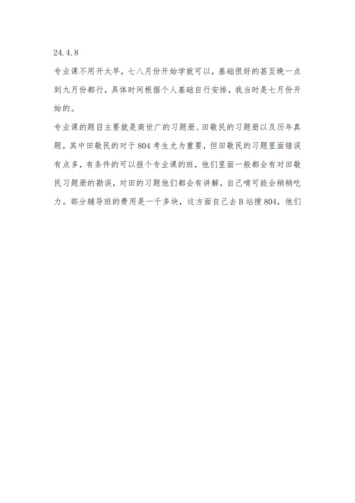 24.4.8专业课不用开太早,七八月份开始学就可以,基础很好的甚至晚一点到九月份都行,具体时间根据个人基础自行安排,我当时是七月份开始的。专业课的题目主要就是商世广的习题册、田敬民的习题册以及历年真题,其中田敬民的对于804考生尤为重要,但田敬民的习题里面错误有点多,有条件的可以报个专业课的班,他们里面一般都会有对田敬民习题册的勘误,对田的习题他们都会有讲解,自己啃可能会稍稍吃力。部分辅导班的费用是一千多块,这方面自己去B站搜804,他们24.4.8专业课不用开太早,七八月份开始学就可以,基础很好的甚至晚一点到九月份都行,具体时间根据个人基础自行安排,我当时是七月份开始的。专业课的题目主要就是...