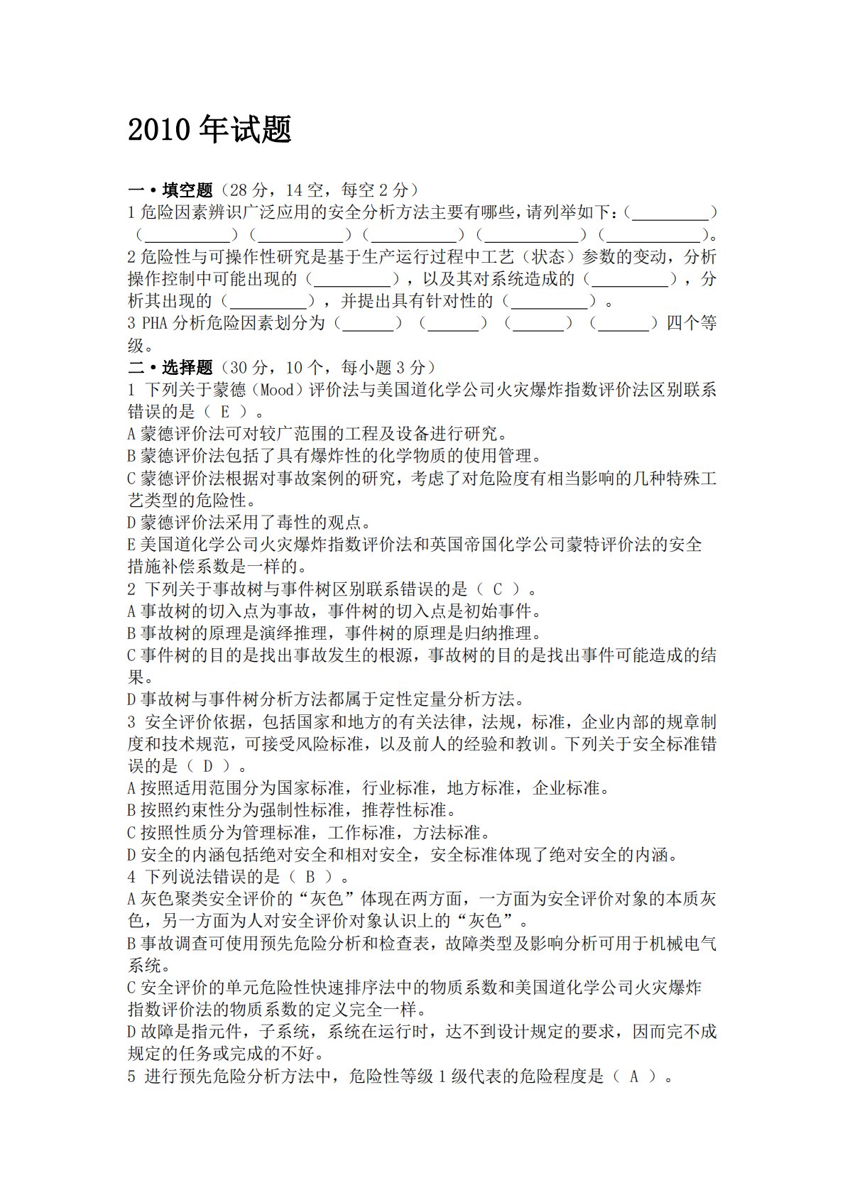2010年试题一·填空题(28分,14空,每空2分)1危险因素辨识广泛应用的安全分析方法主要有哪些,请列举如下:()()()()()()。2危险性与可操作性研究是基于生产运行过程中工艺(状态)参数的变动,分析操作控制中可能出现的(),以及其对系统造成的(),分析其出现的(),并提出具有针对性的()。3PHA分析危险因素划分为()()()()四个等级。二·选择题(30分,10个,每小题3分)1下列关于蒙德(Mood)评价法与美国道化学公司火灾爆炸指数评价法区别联系错误的是(E)。A蒙德评价法可对较广范围的工程及设备进行研究。B蒙德评价法包括了具有爆炸性的化学物质的使用管理。C蒙德评价法根据对事故...