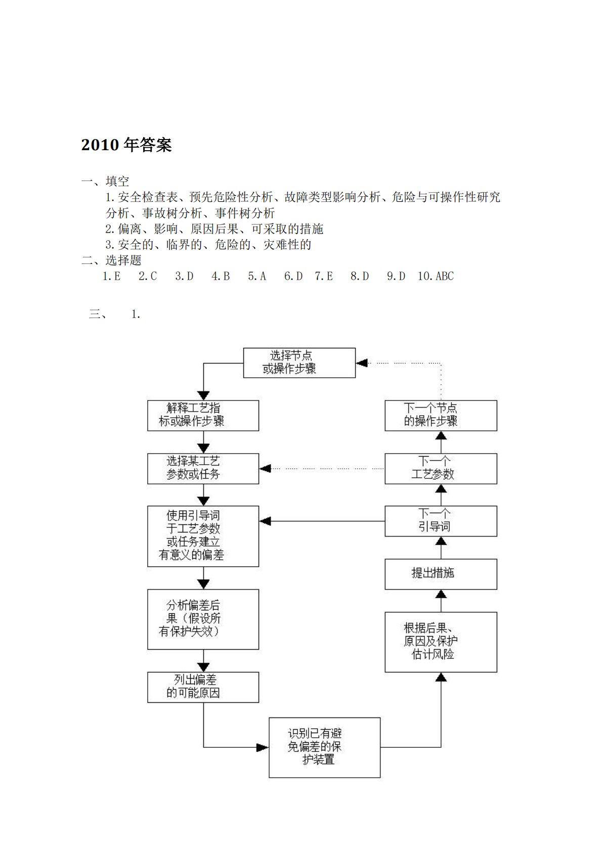三、1.1.安全检查表、预先危险性分析、故障类型影响分析、危险与可操作性研究分析、事故树分析、事件树分析2.偏离、影响、原因后果、可采取的措施3.安全的、临界的、危险的、灾难性的2010年答案一、填空二、选择题1.E2.C3.D4.B5.A6.D7.E8.D9.D10.ABC2.(1)(2)(3)(4)ABCDE3.题目一样百校文库—海量高校资料共享库百校文库是一个线上大学生专业学习资料共享平台,致力于通过用户自主上传与分享,打造一个涵盖各大高校、各学科门类的免费资源中心。平台已积累50万+套历年真题与100万+条学习文档,覆盖绝大多数高校专业,所有资料均由各大高校学生自主上传。✅资料透明,直...