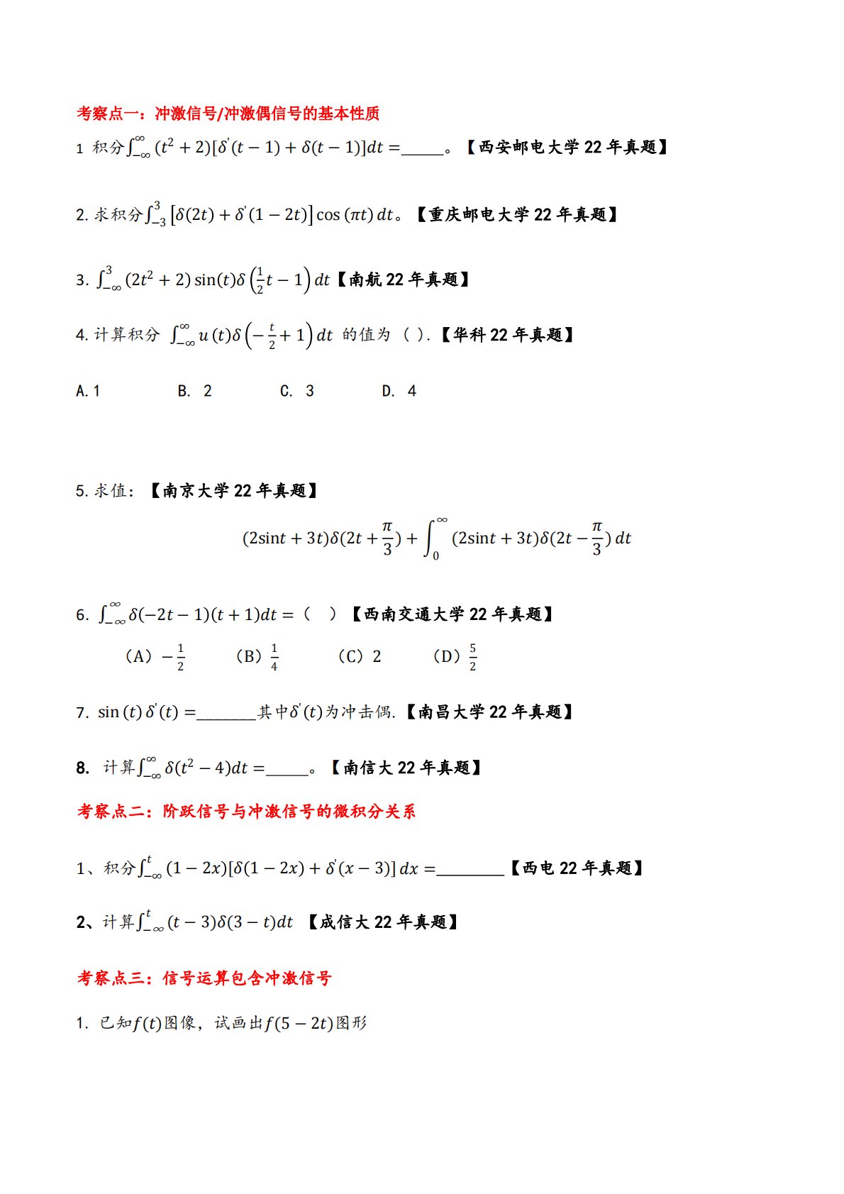 考察点一:冲激信号/冲激偶信号的基本性质1积分−∞∞(2+2)['(−1)+(−1)]=。【西安邮电大学22年真题】2.求积分−332+'1−2cos。【重庆邮电大学22年真题】3.−∞322+2sin12−1【南航22年真题】4.计算积分−∞∞−2+1的值为().【华科22年真题】A.1B.2C.3D.45.求值:【南京大学22年真题】(2sin+3)(2+3)+0∞(2sin+3)(2−3)6.−∞∞−2−1+1=()【西南交通大学22年真题】(A)−12(B)14(C)2(D)527.sin'=...
